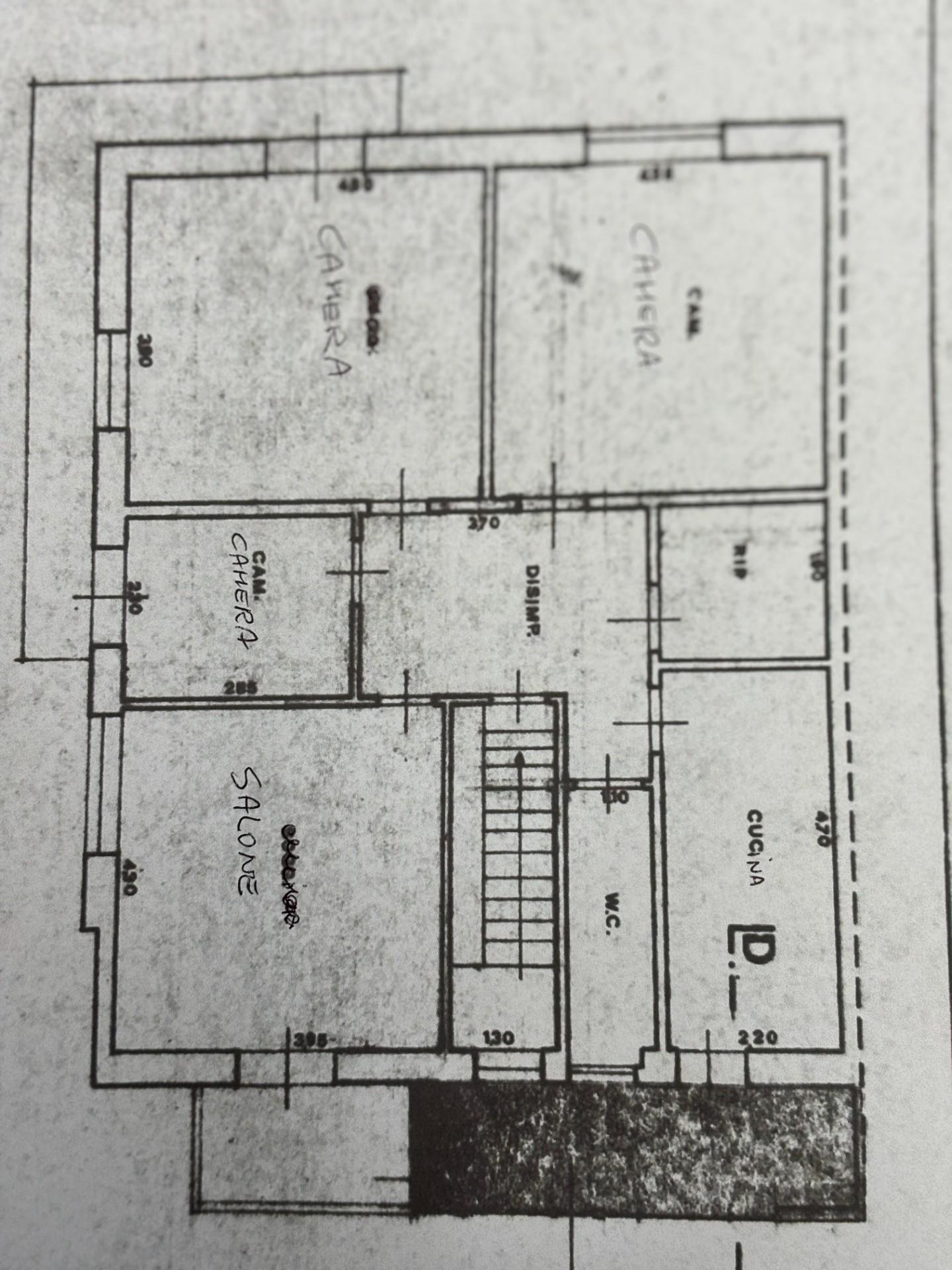 Ingresso nel living, cucina abitabile, ampio ripostiglio o dispensa, disimpegno notte, due camere matrimoniali, una camera singola, bagno.