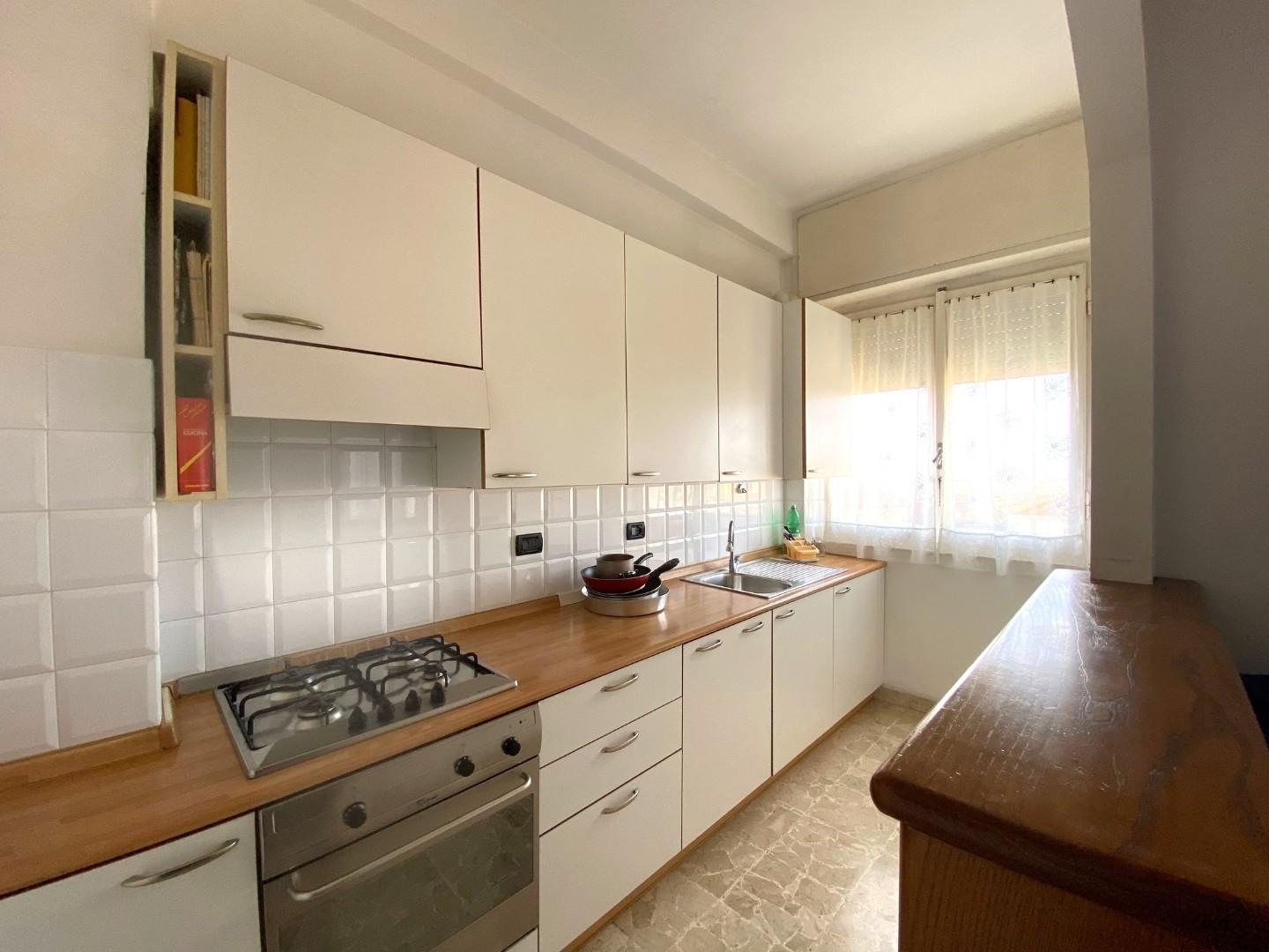 Servito di ascensore, internamente si compone di ingresso tradizionale, sala con terrazza vista monti, cucina-tinello con balcone e vista mare, disimpegno notte, tre camere matrimoniali, bagno con vasca.