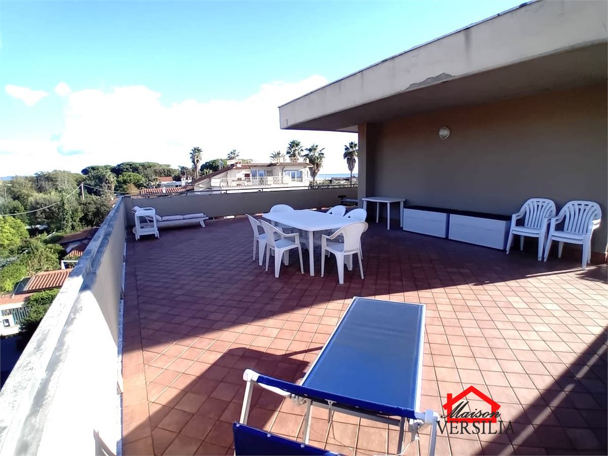 A due passi dal lungomare di Cinquale, vicinissimo a Forte dei Marmi, si propone in vendita appartamento di circa 150 mq. \nSuoi punti di maggior pregio sono la vicinanza al mare (90 m), piscina condominiale, posto auto e meravigliosa terrazza con vista mare e sulle Apuane.