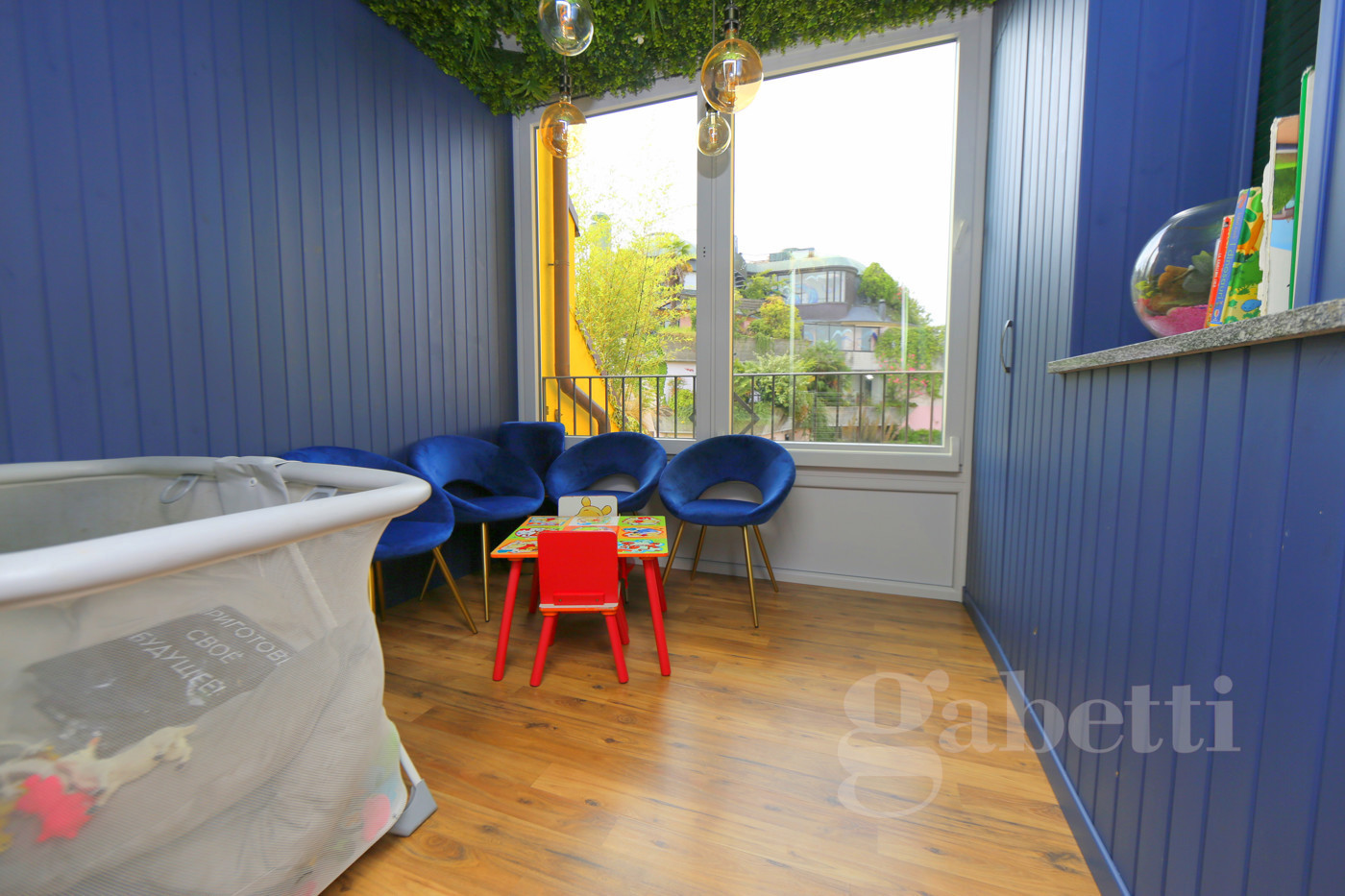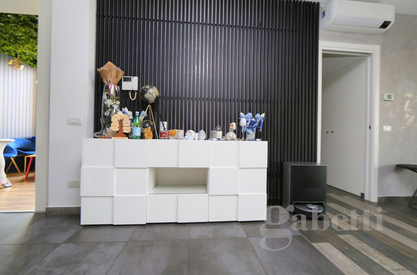 L'ingresso, al terzo piano della palazzina, sulla grande zona giorno che ospita la cucina separata eventualmente ampliabile sfruttando il locale studio ricavato dal balcone, nel salone doppio trovano spazio la zona relax/TV e la zona pranzo, il soggiorno ha esposizione sul terrazzo di 40mq, piacevole spazio arredabile e sfruttabile come zona relax.