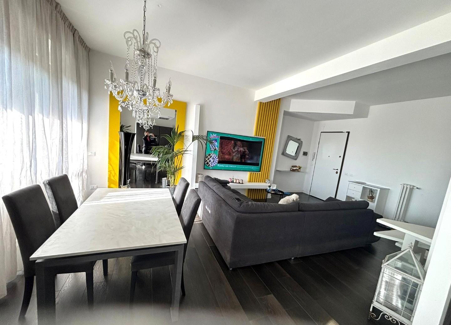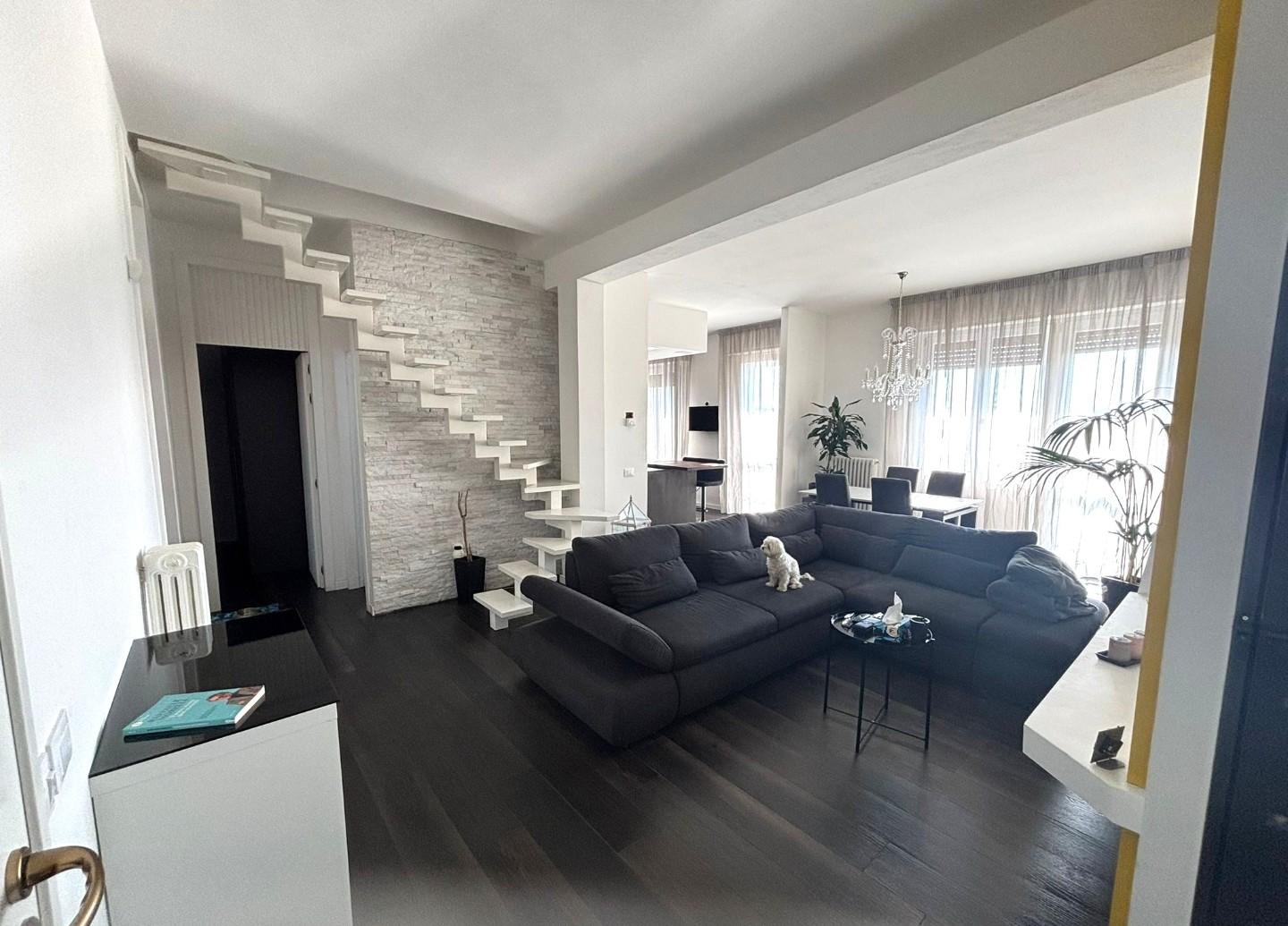 Lingresso apre su una grande zona giorno eccezionalmente illuminata da ampie vetrate esposte a sud: living con zona pranzo e ampia cucina con isola, realizzati con un raffinato gusto moderno e una ricercata praticità con accesso alle due deliziose logge con affacci liberi sullorizzonte.