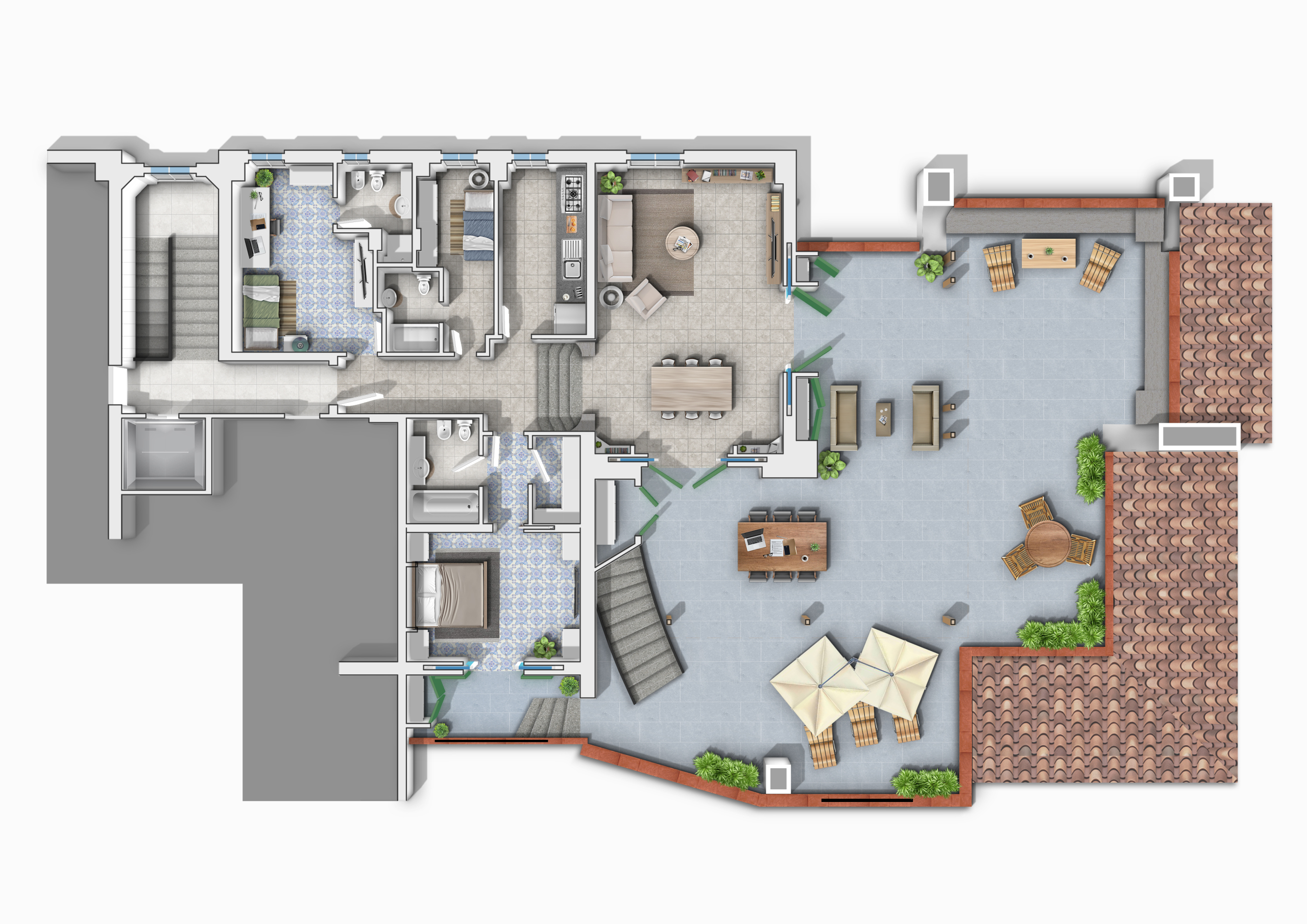 Limmobile si compone di tre camere, ciascuna dotata di bagno en-suite, una cucina indipendente e un ampio salone con zona pranzo, caratterizzato da spazi generosi e grande luminosità. Il vero valore aggiunto della proprietà è rappresentato dalle ampie terrazze, disposte su due livelli, che regalano un raro senso di apertura e libertà. Gli spazi esterni includono aree perfette per pranzi allaperto, zone relax e angoli panoramici, oltre a ripostiglio e spogliatoio, ideali per organizzare al meglio la vita estiva.