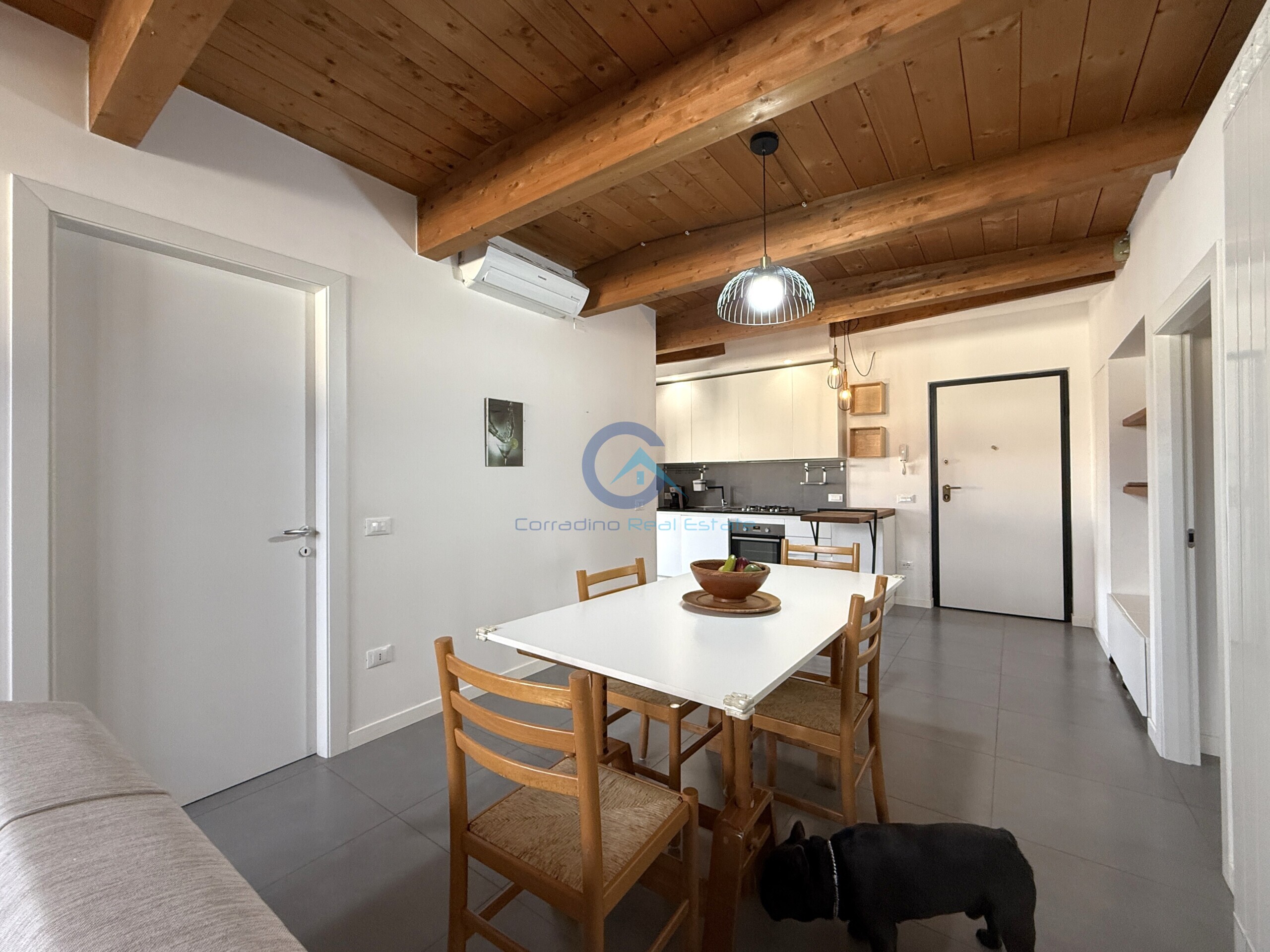 Limmobile, caratterizzato da soffitti in legno con travature a vista e particolari architettonici di rilievo, allinterno si compone da: ingresso su soggiorno living con cucina a vista e accesso al terrazzino dove si gode una vista panoramica fino al mare, bagno con zona lavanderia, due camere da letto di cui una con balcone e bagno padronale con vasca.