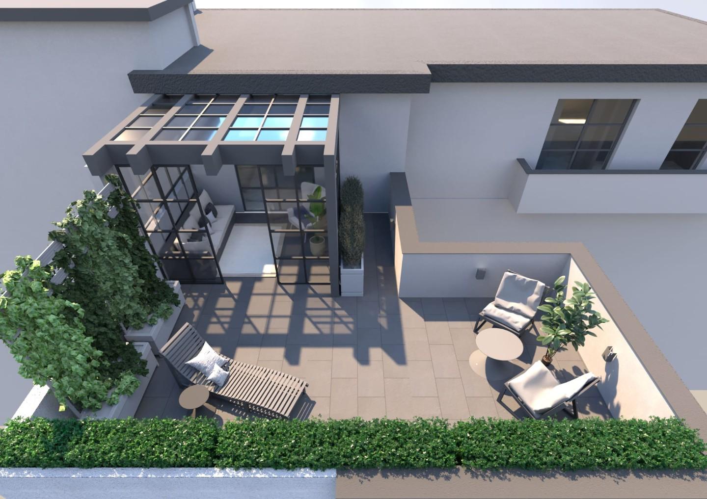 L'appartamento si compone di ingresso, affaccio su splendida TERRAZZA PANORAMICA di mq. 40 ca , (suddivisa con una parte dedicata al giardino d'inverno, zona relax e zona pavimentata), ripostiglio , soggiorno -cucina- pranzo, disimpegno notte, due camere matrimoniali , doppi servizi di cui uno finestrato e balcone (ca mq,13). LUMINOSISSIMO! Nel resede tergale 2 POSTI AUTO DI PROPRETA' (di cui uno coperto) Massima cura dei materiali e nei dettagli.