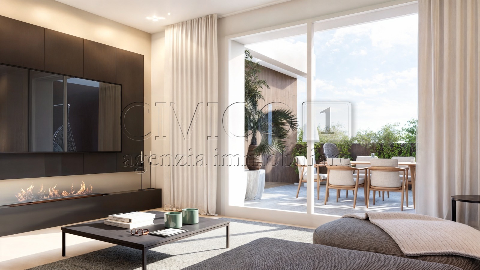 Caratteristiche dell'immobile: Zona giorno open space con angolo cottura e accesso diretto al terrazzo living tramite ampio alzante scorrevole.