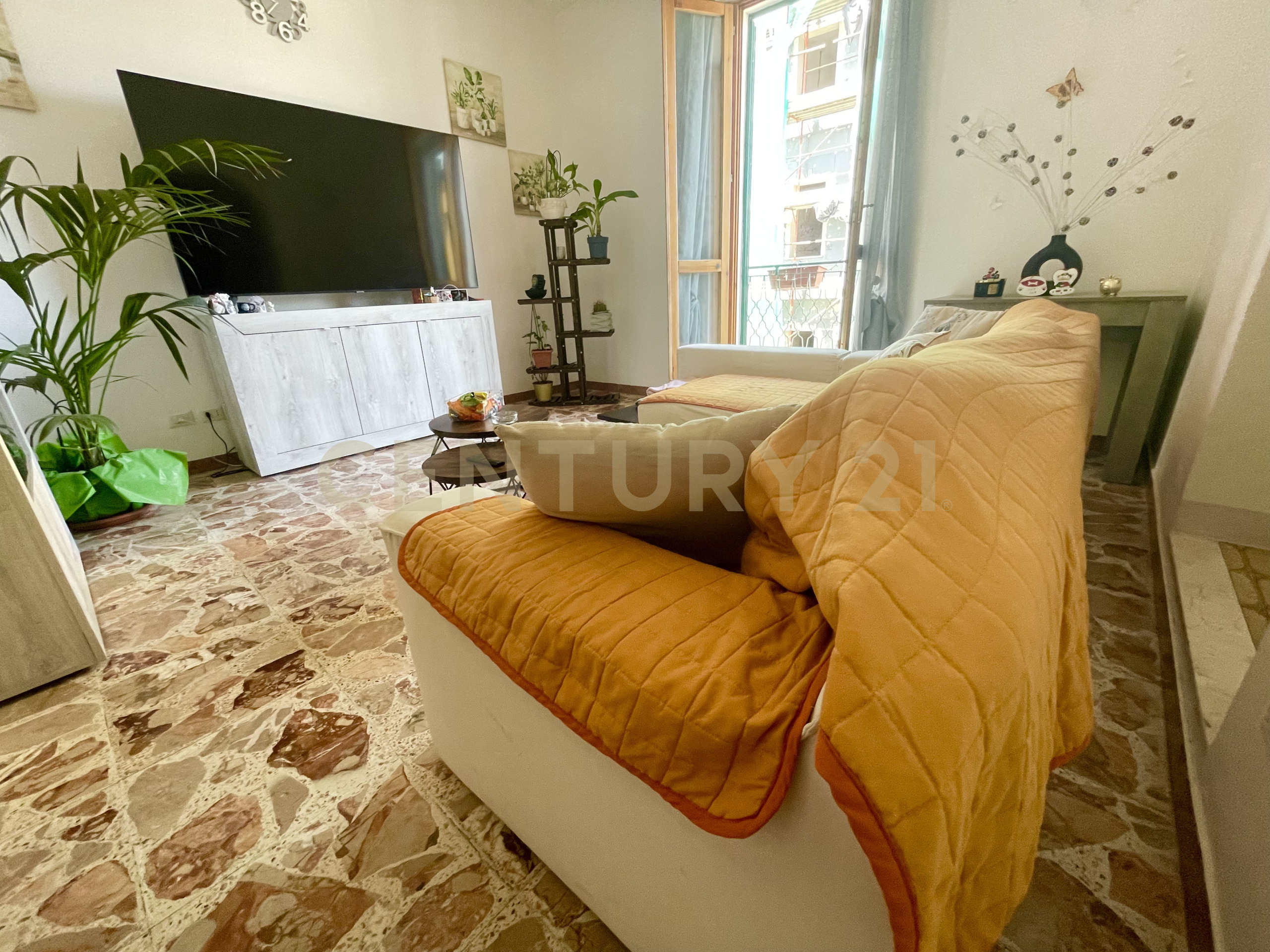 Salendo le scale, si arriva al primo piano dove si apre un luminoso soggiorno, impreziosito da un balcone con vista sulle antiche mura, che aggiunge un tocco di luce e prestigio all'ambiente.