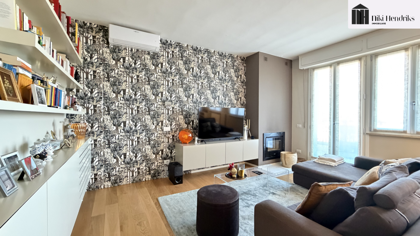 Limmobile, frutto della fusione di due unità abitative, occupa lintero piano e si distingue per ampi spazi, luminosità e finiture moderne.