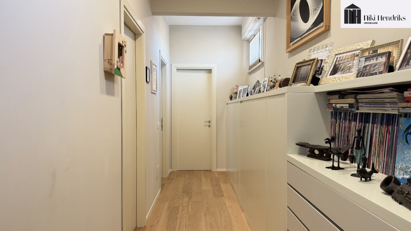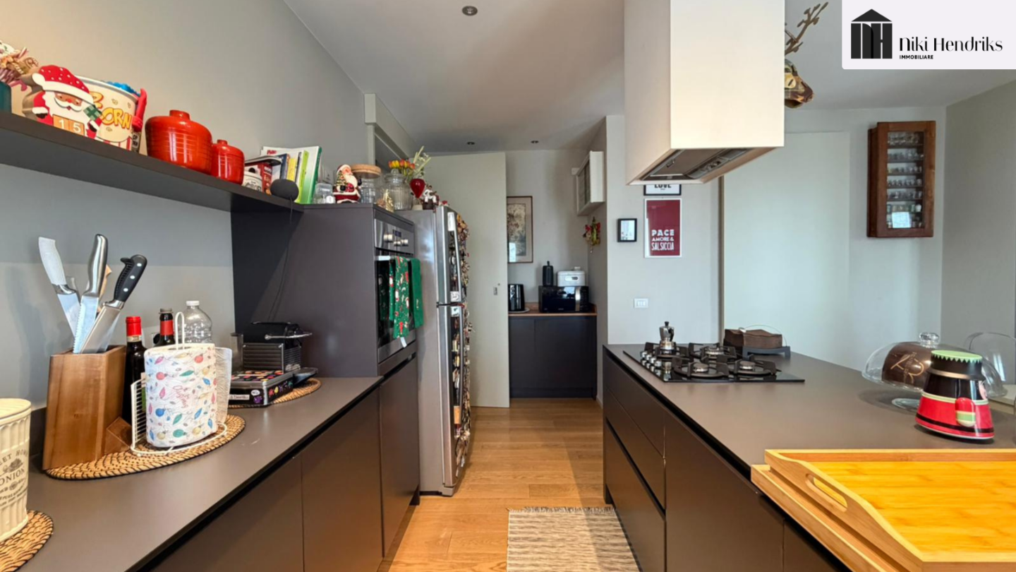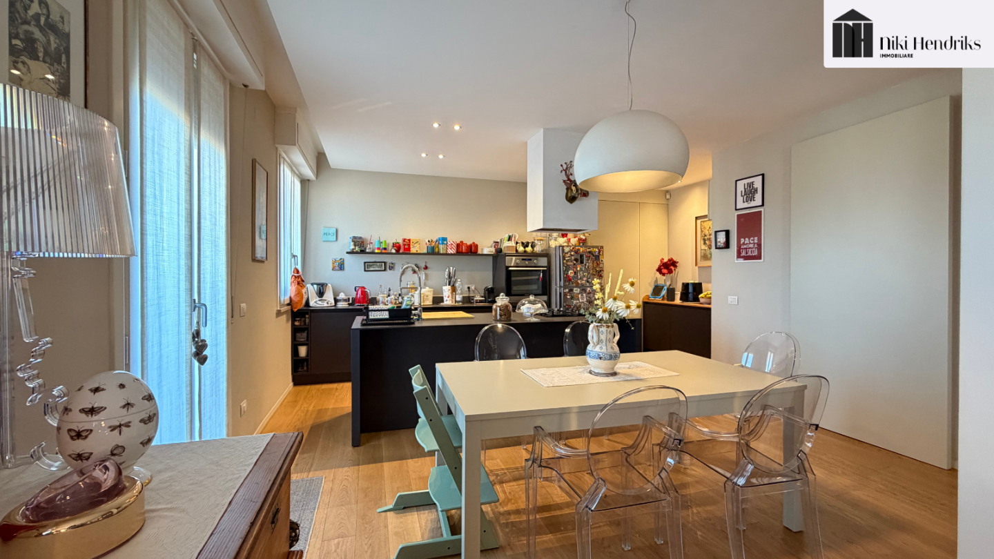 Lingresso conduce alla zona giorno, composta da cucina moderna a vista, sala da pranzo e pratico ripostiglio.