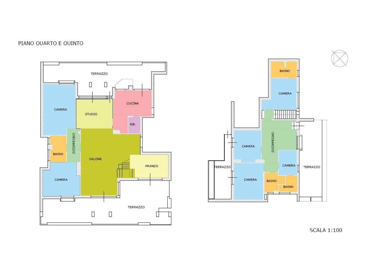 Una comoda scala interna conduce al quinto piano, dove troviamo un soggiorno, tre camere da letto, doppi servizi, una camera con bagno di servizio e due terrazzi per un totale di 40 mq, perfetti per momenti di relax o intrattenimento.