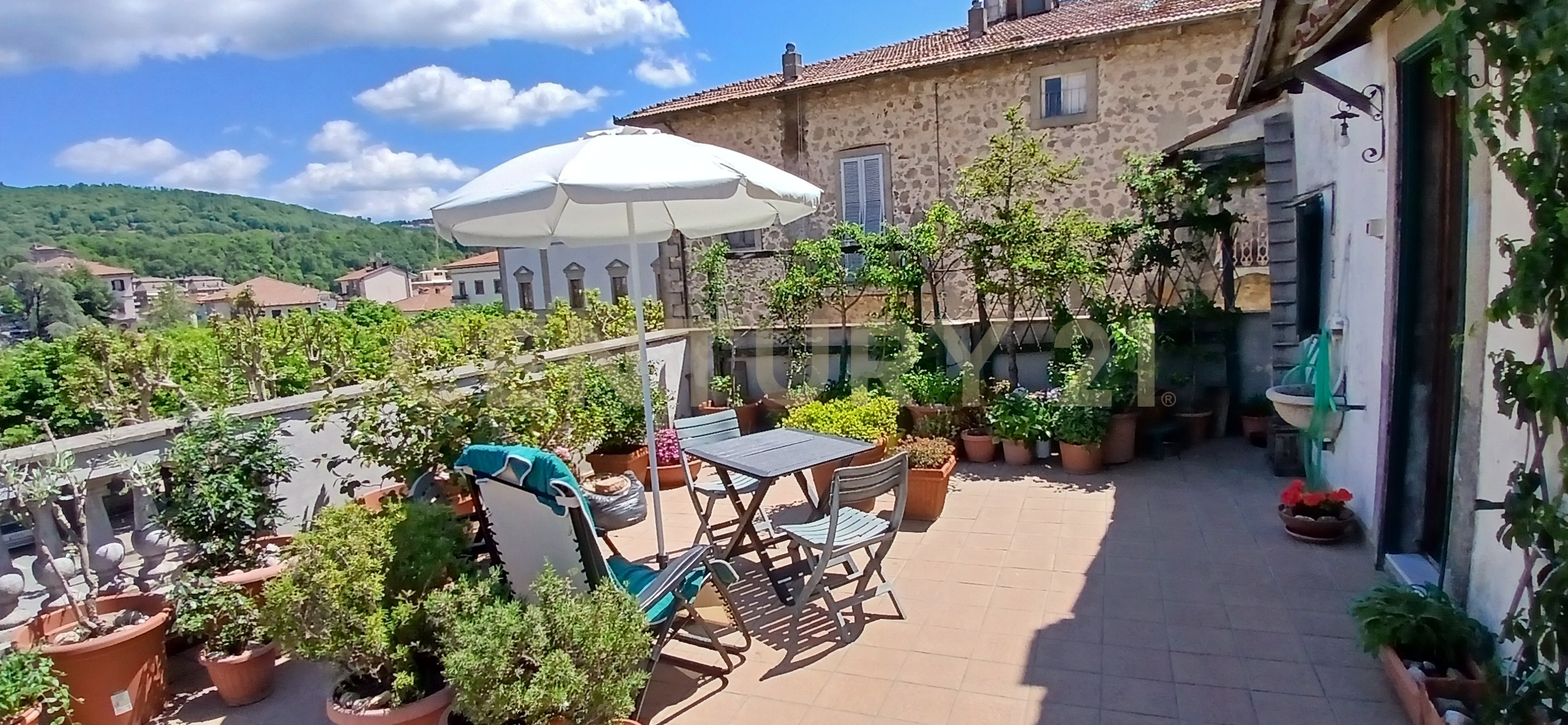La zona giorno è composta da un soggiorno elegante e molto luminoso, impreziosito da camino e da una porta finestra che conduce allampio terrazzo panoramico, ideale per momenti di relax allaperto con vista sul borgo e sul paesaggio circostante.