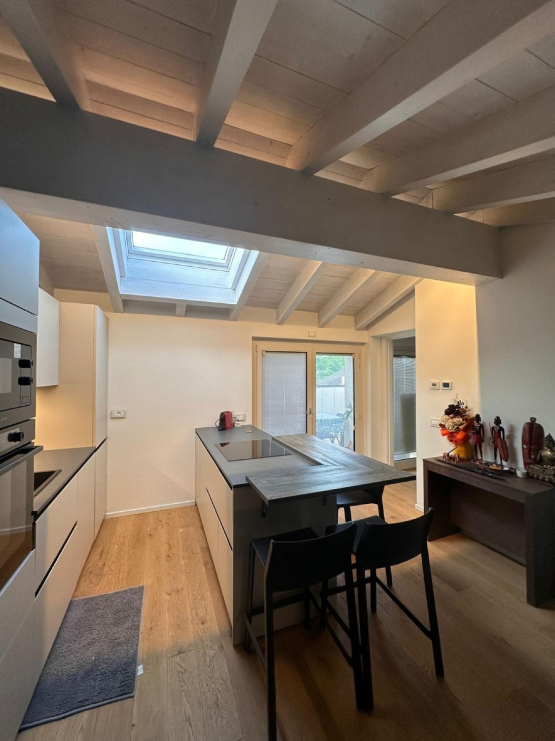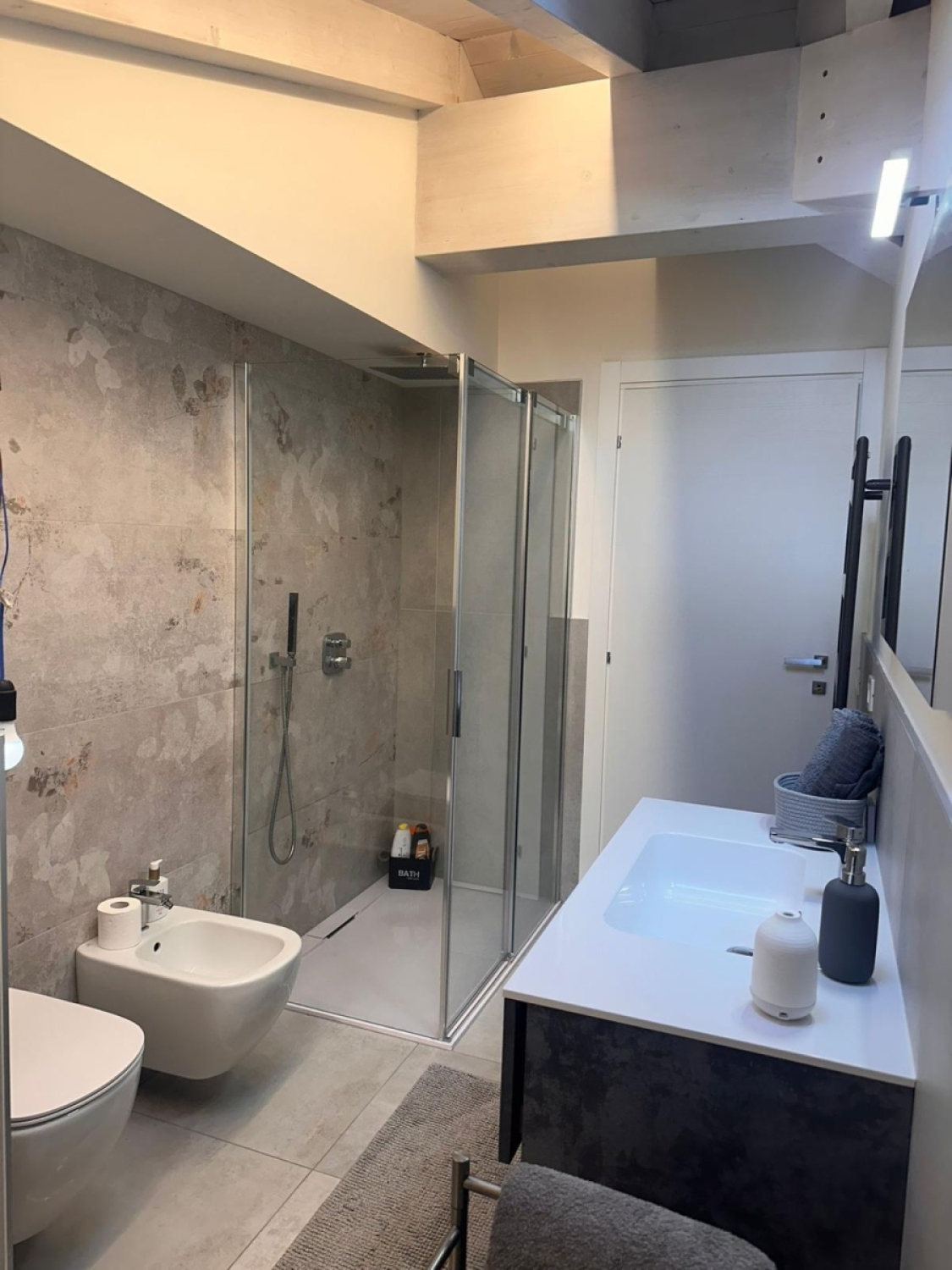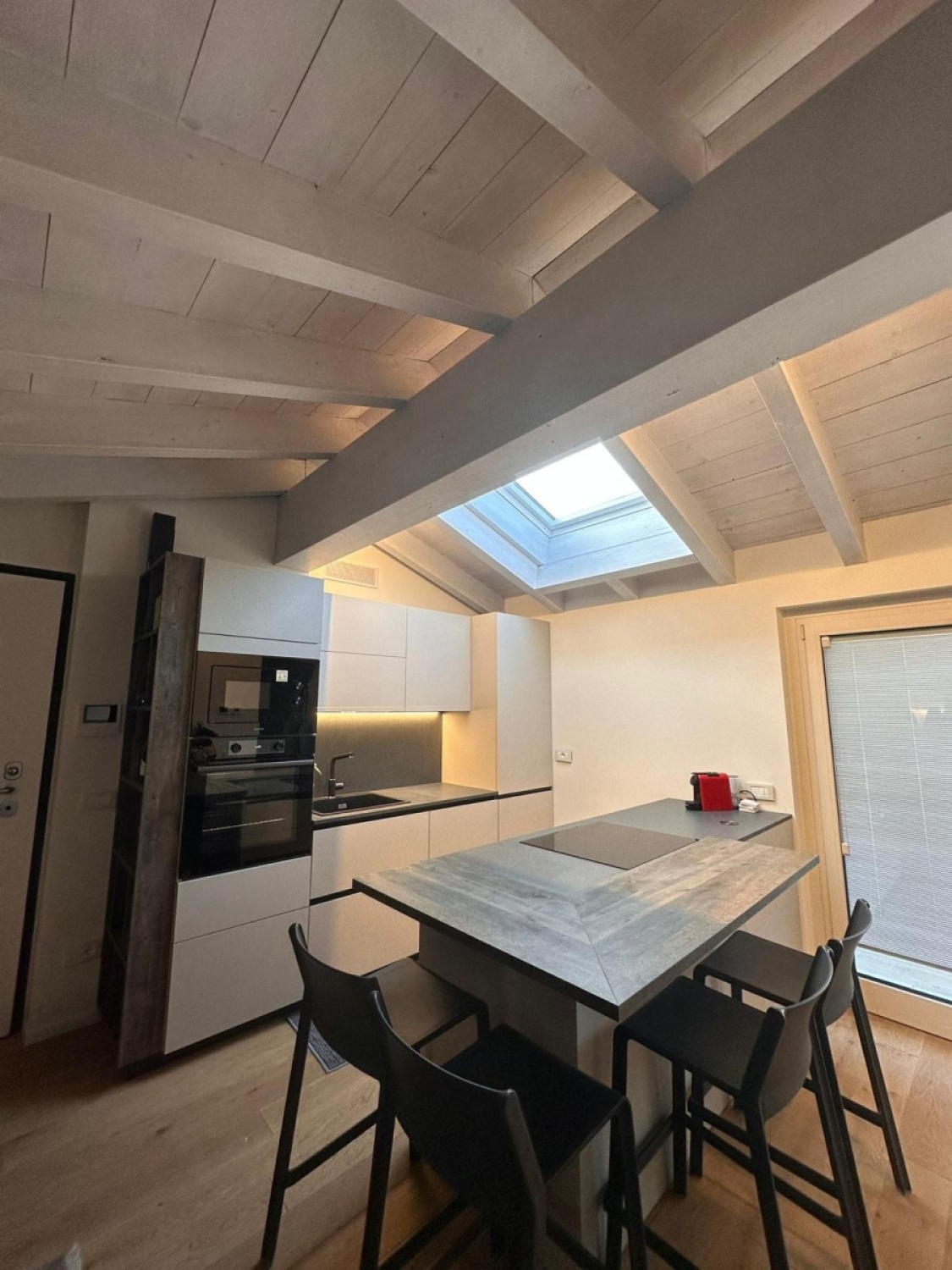 Situato all’ultimo piano di una recente realizzazione, ultimata appena due anni fa, l’appartamento accoglie con un ampio open space dove la luce danza tra cucina e soggiorno.