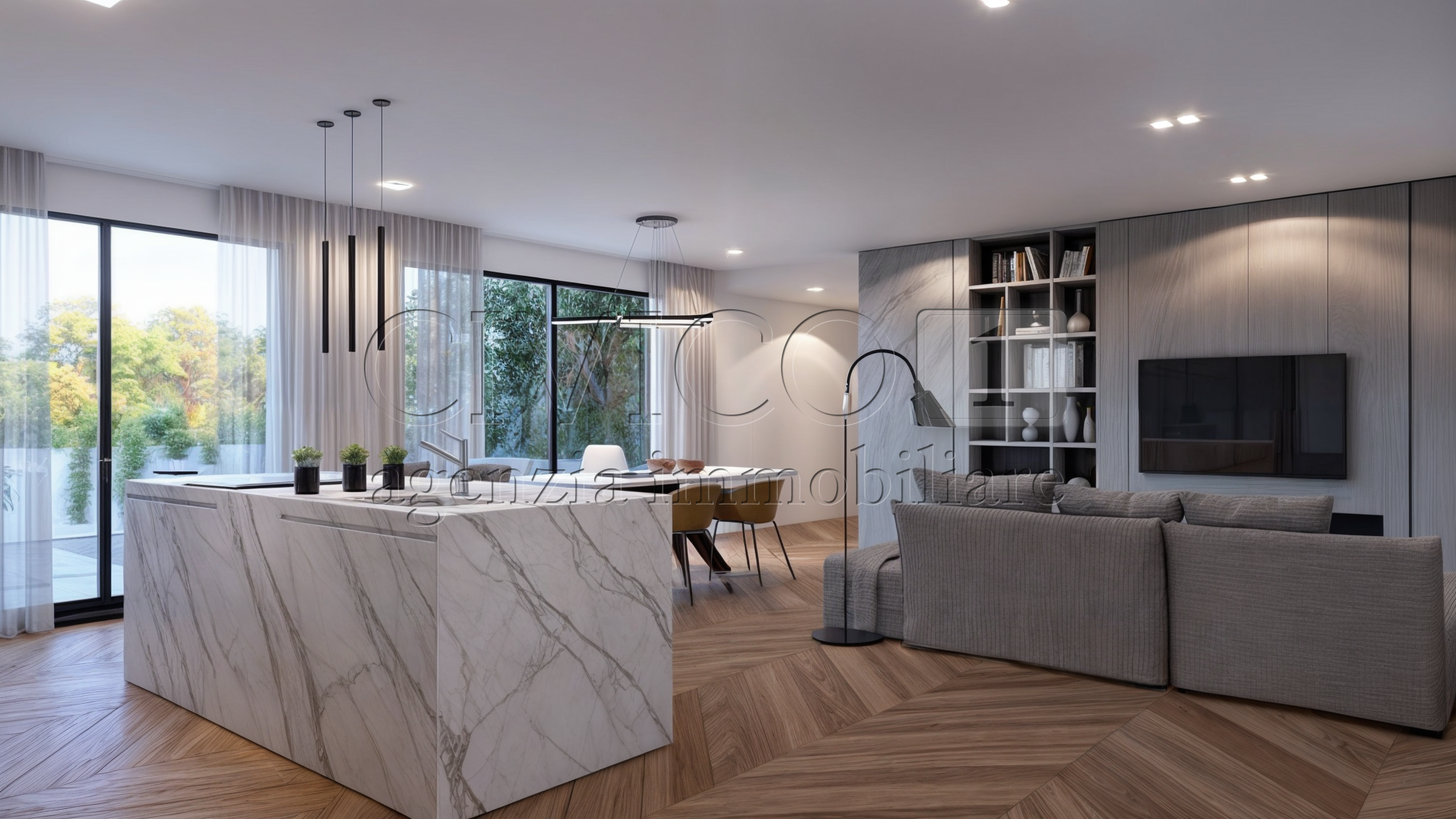 La zona giorno, di circa 60 mq, è caratterizzata da un doppio affaccio e da unampia vetrata alzante scorrevole che conduce al generoso terrazzo living, ideale per vivere appieno gli spazi esterni.