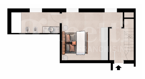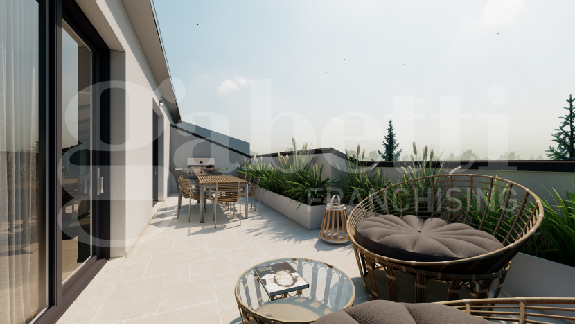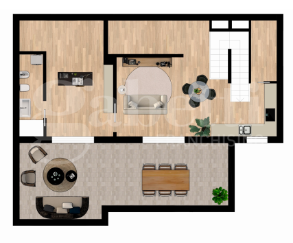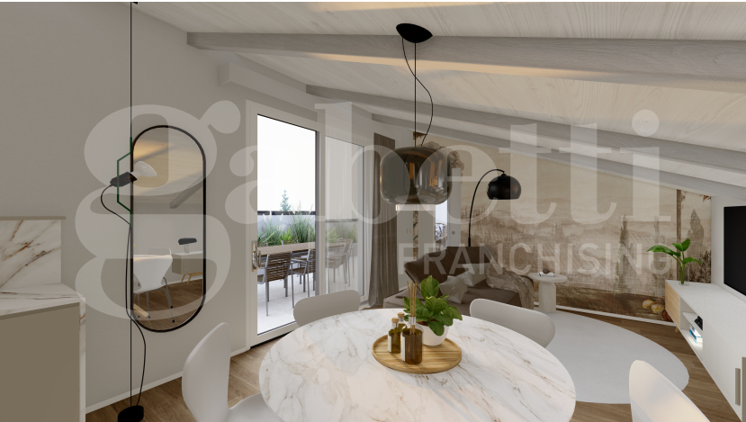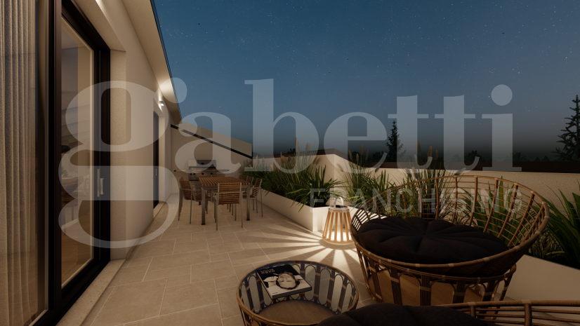 L' appartamento in questione un ampio trilocale disposto su due livelli e cos composto: al piano 1° troviamo una camera matrimoniale ed un bagno finestrato, al piano superiore ampia zona living con parete cottura a vista ed accesso al meraviglioso terrazzo di 32mq, camera singola/studio ed ulteriore bagno.