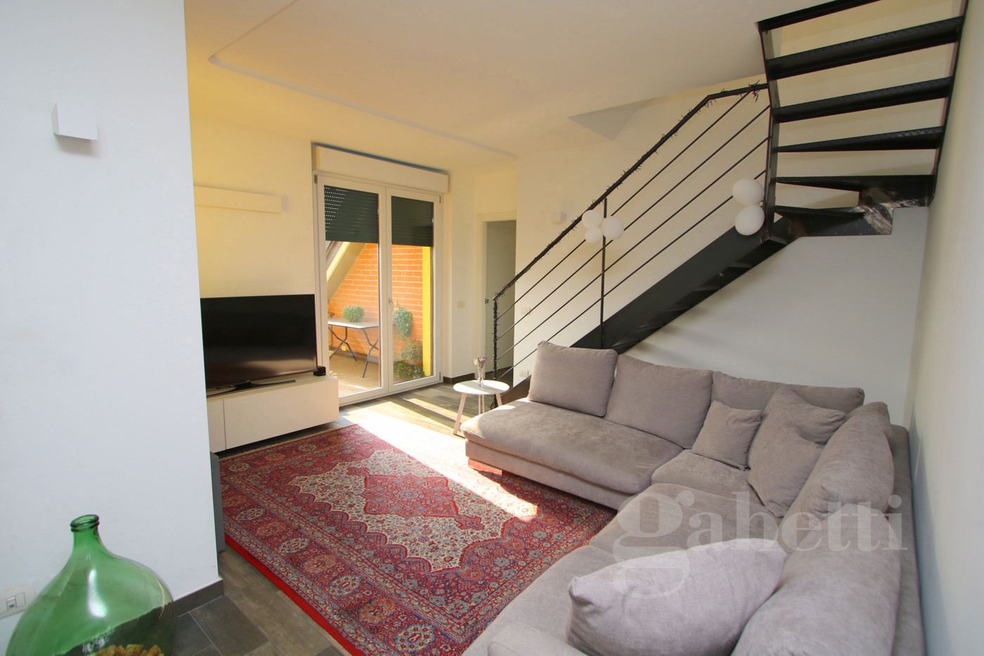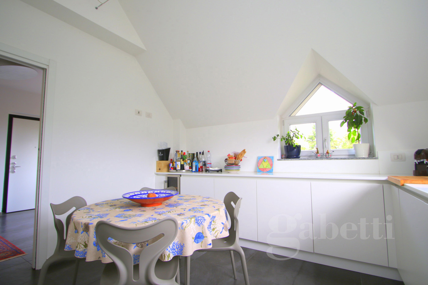 L'ingresso, al terzo piano della palazzina, sull'ampio disimpegno dal quale si raggiungono: la cucina abitabile di pianta quadrata, caratterizzata dal soffitto a spiovente e da due finestre triangolari che ne riprendono il movimento; il soggiorno, piacevole spazio relax con affaccio sul terrazzo di 40mq che costituisce naturale prosecuzione della zona giorno e sfruttabile come ulteriore grande zona pranzo/relax; presenti al piano anche una camera da letto matrimoniale dotata di ulteriore terrazzo di 30mq e bagno con vasca.