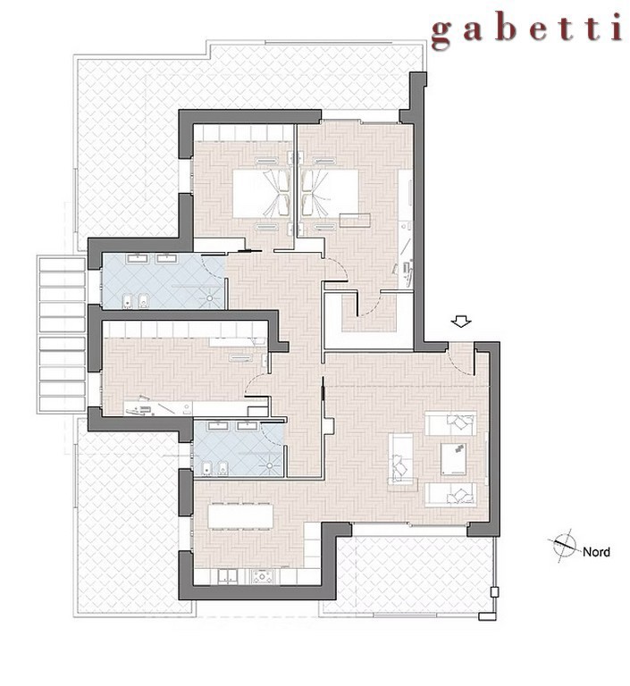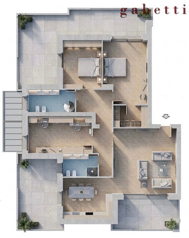 Questa soluzione si compone di un grande soggiorno con ampia cucina abitabile; il disimpegno conduce alla zona notte composta da camera matrimoniale con cabina armadio, cameretta, camera matrimoniale e doppi servizi.