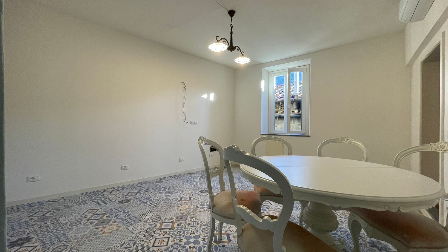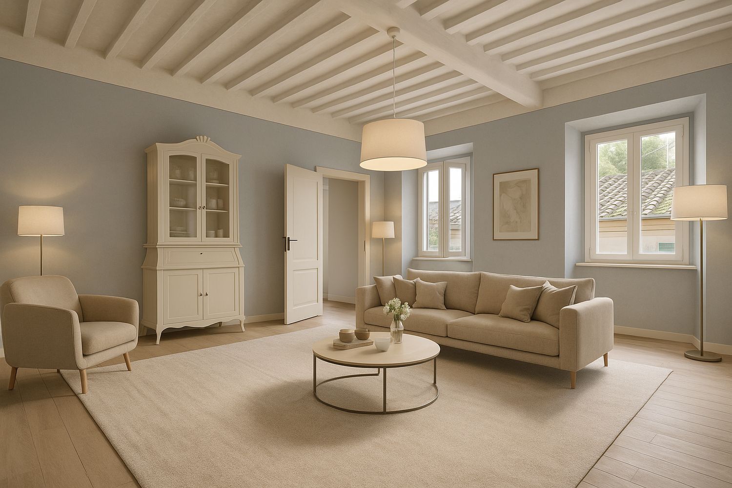 Il soggiorno, ampio e luminoso, è il cuore pulsante della casa, impreziosito da finiture storiche e da dettagli architettonici che conferiscono un tocco di raffinatezza.