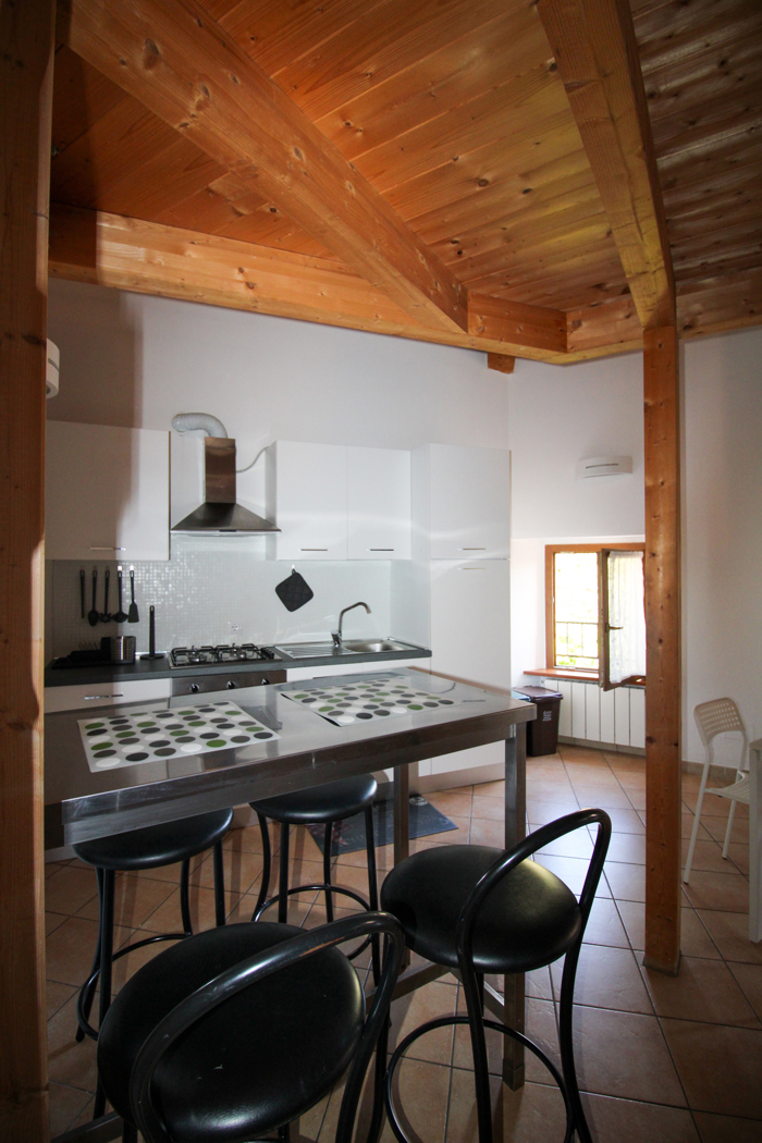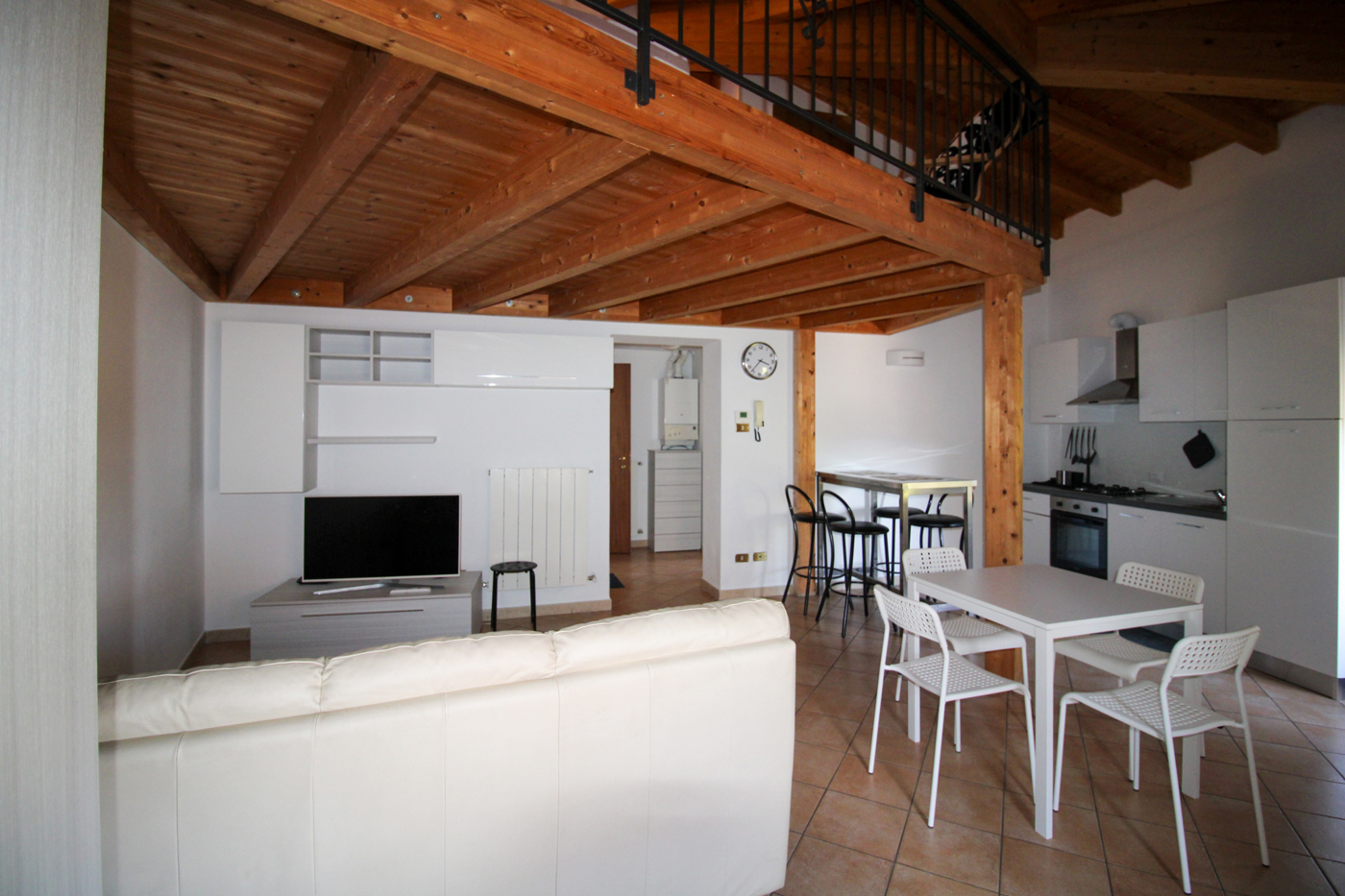 Salendo una caratteristica scala in legno entriamo in un piccolo locale con divano dal quale accediamo ad una camera da letto soppalcata con travi a vista.