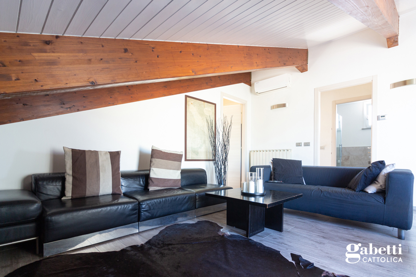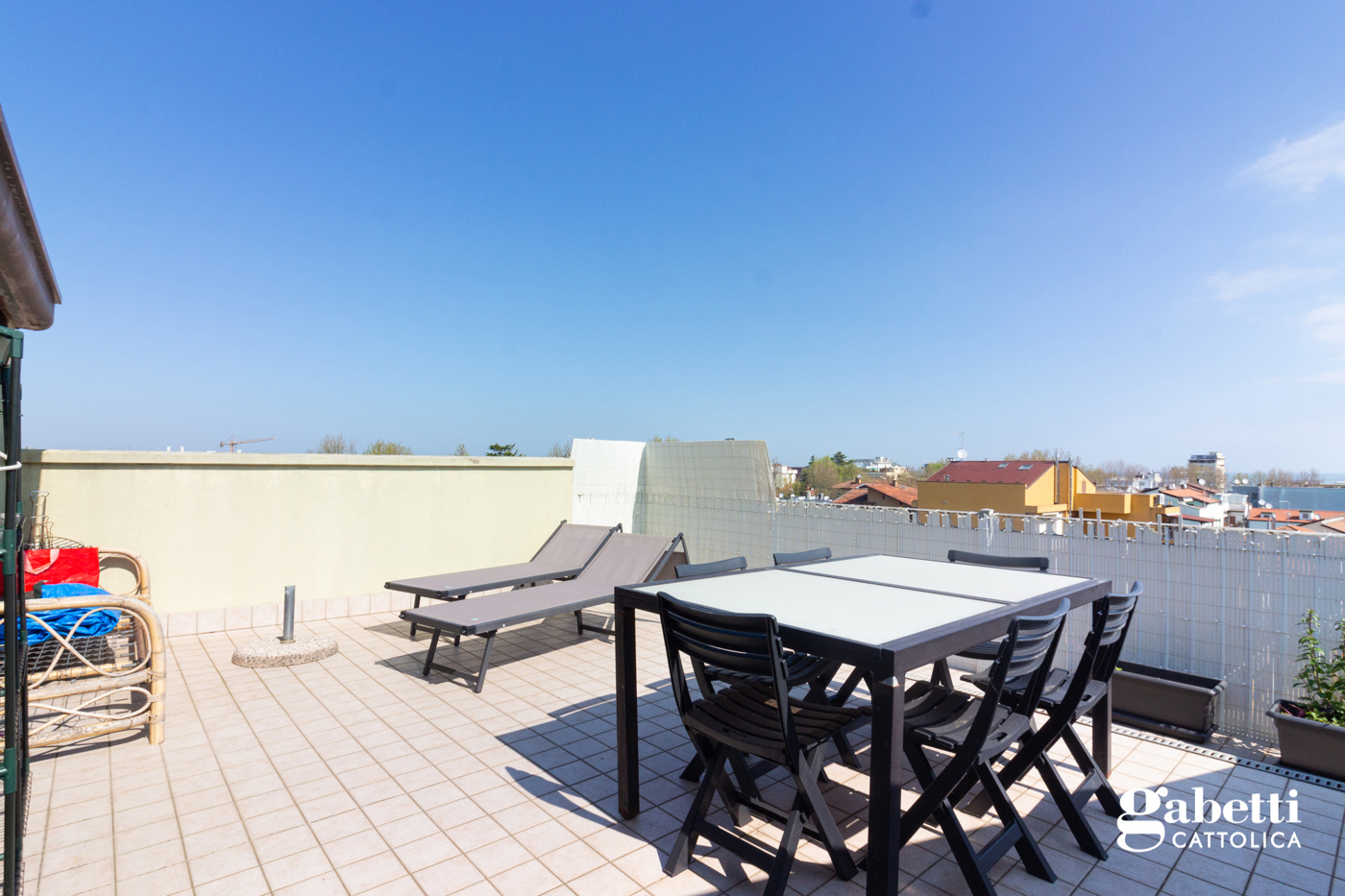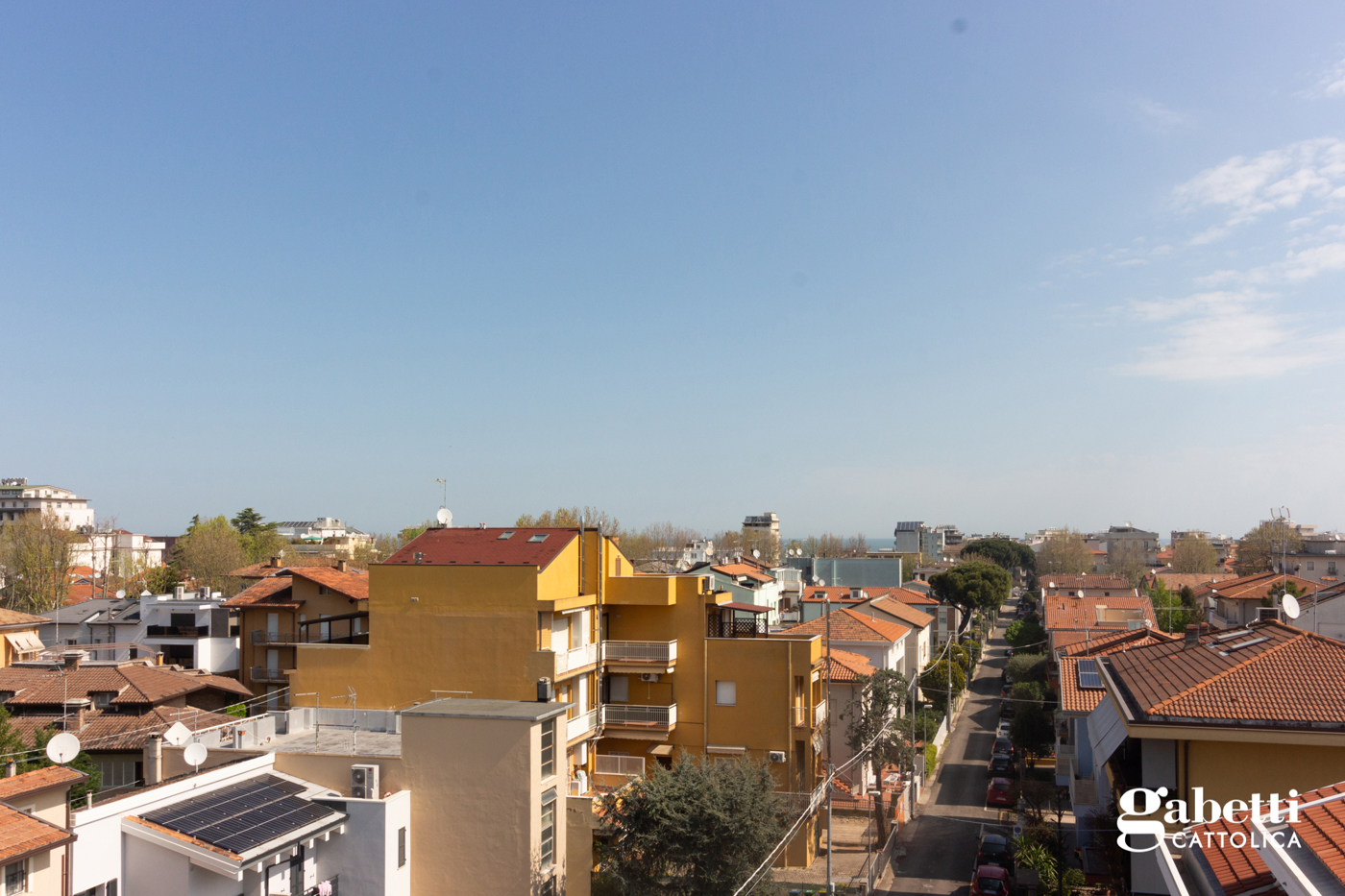 IN ESCUSIVA - CATTOLICA ZONA CENTRO MARE In una delle posizioni pi ricercate, a breve distanza dalla spiaggia e dal centro storico, attico al quarto ed ultimo piano servito da ascensore in signorile stabile di sole quattro unit. Ampia e luminosa zona giorno servita da terrazzo abitabile di 25mq con vista panoramica, cucina, due camere da letto, bagno e ulteriore balcone con accesso da ogni ambiente.