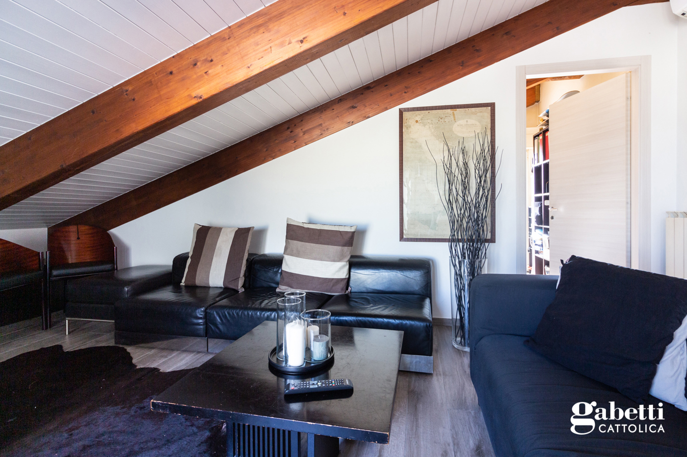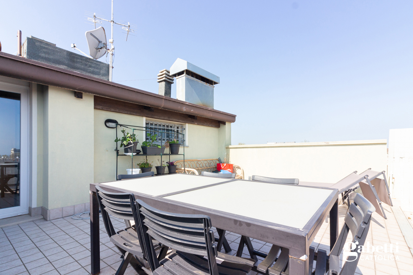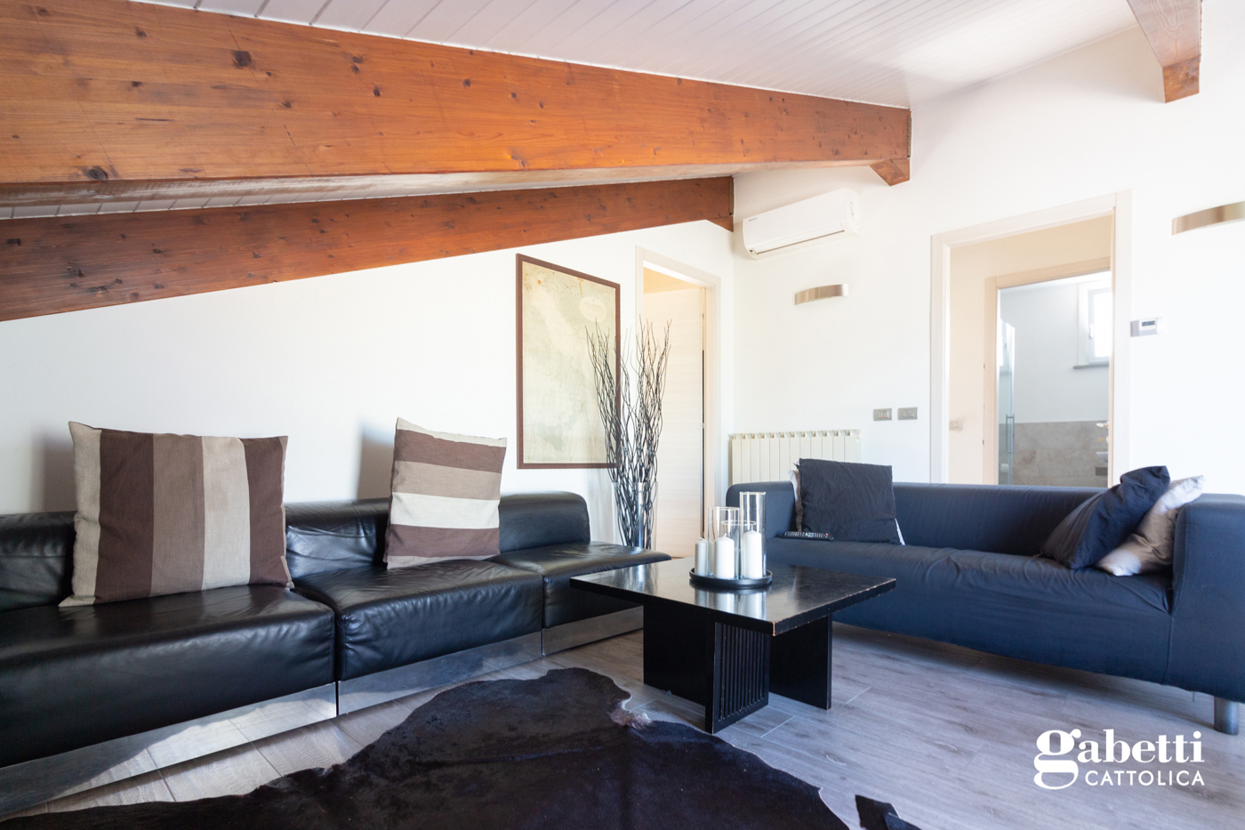 IN ESCUSIVA - CATTOLICA ZONA CENTRO MARE In una delle posizioni pi ricercate, a breve distanza dalla spiaggia e dal centro storico, attico al quarto ed ultimo piano servito da ascensore in signorile stabile di sole quattro unit. Ampia e luminosa zona giorno servita da terrazzo abitabile di 25mq con vista panoramica, cucina, due camere da letto, bagno e ulteriore balcone con accesso da ogni ambiente.