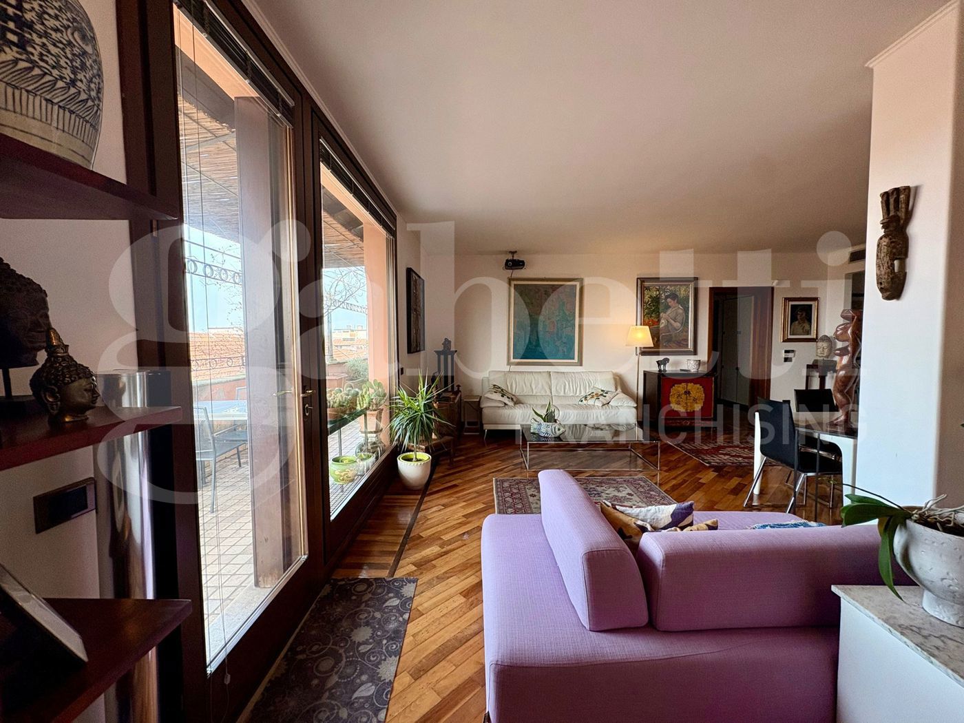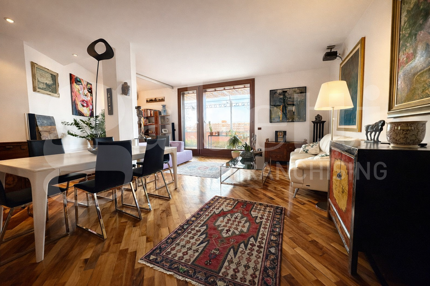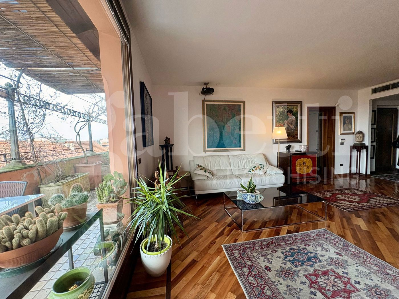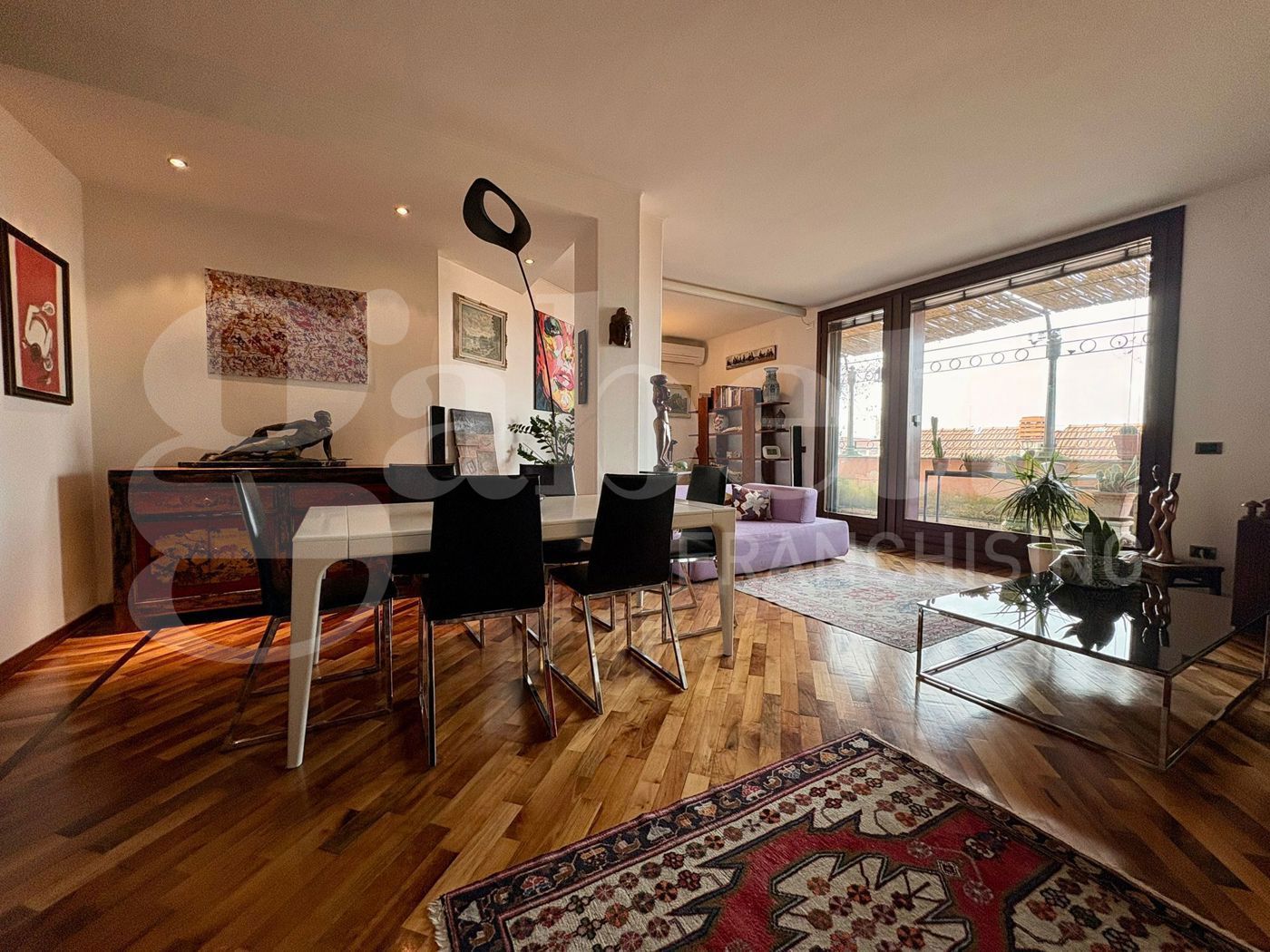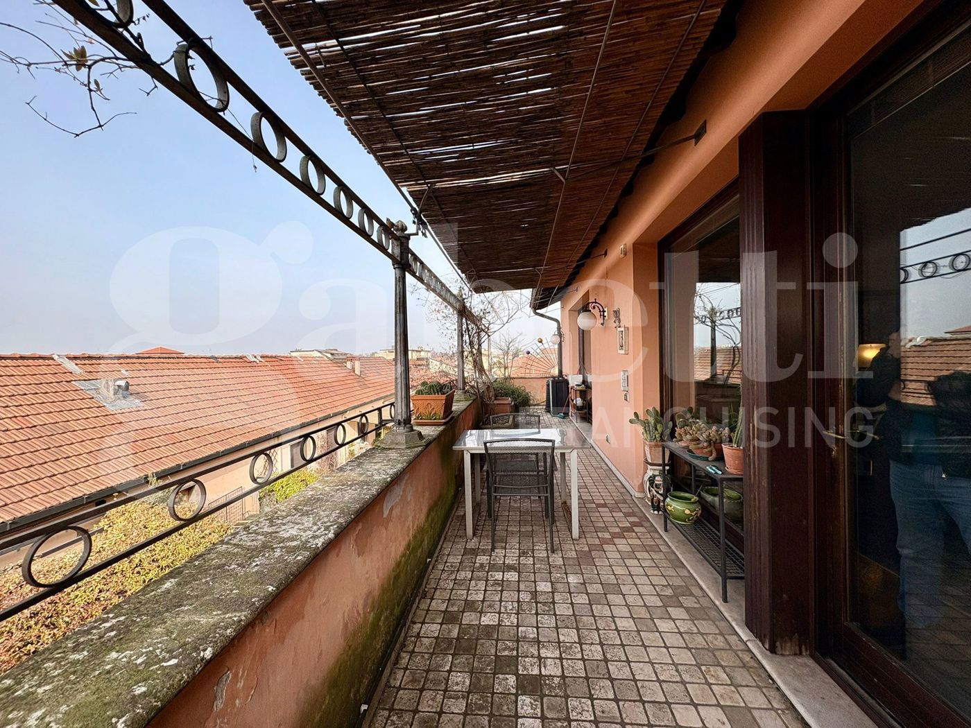 Una spettacolare vetrata dona all'ambiente una luce naturale e conduce alla vera protagonista della casa: una magnifica terrazza privata, ampia e riservata, dalla quale si gode una suggestiva vista sui tetti del centro storico, in un contesto di assoluta tranquillit.