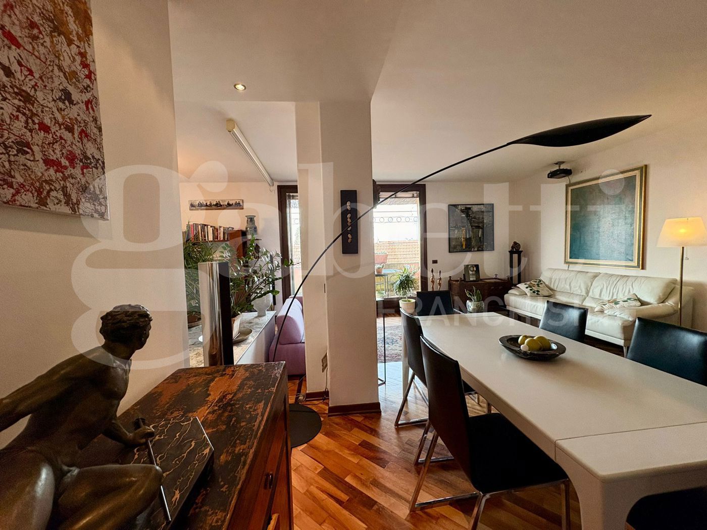 Una spettacolare vetrata dona all'ambiente una luce naturale e conduce alla vera protagonista della casa: una magnifica terrazza privata, ampia e riservata, dalla quale si gode una suggestiva vista sui tetti del centro storico, in un contesto di assoluta tranquillit.