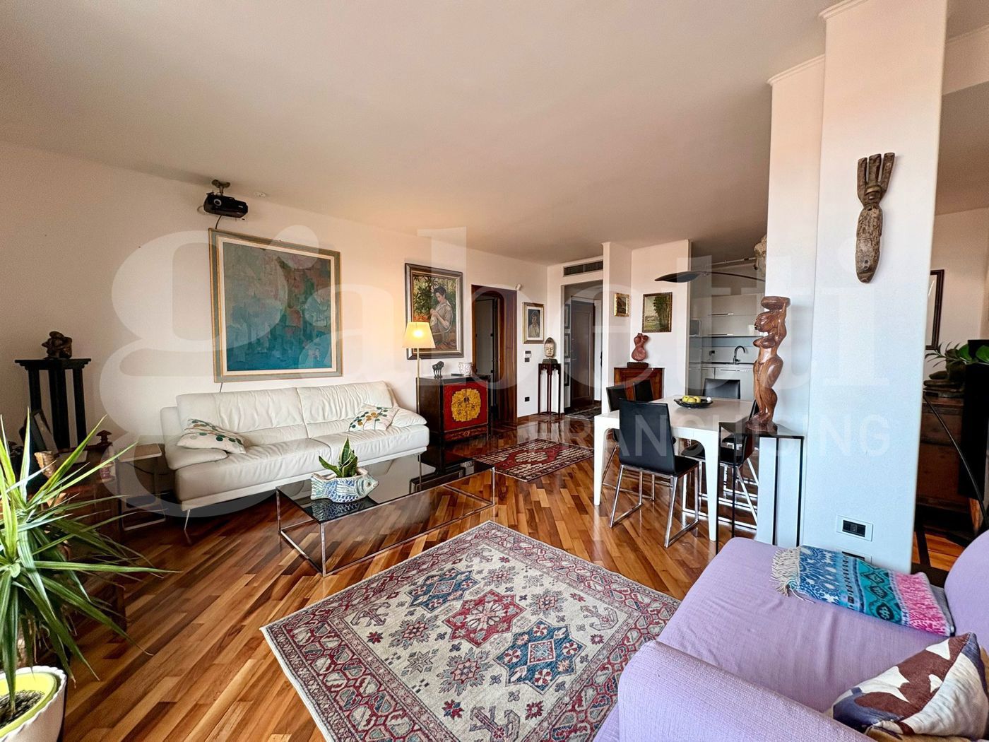 Labitazione valorizzata da finiture di pregio, con parquet nella zona giorno e nella camera da letto e ceramiche di qualit in cucina e bagno; troviamo poi due split per l'aria condizionata, uno nella zona giorno ed uno nella camera da letto, gli infissi sono in legno con doppio vetro ed presente un impianto di allarme.