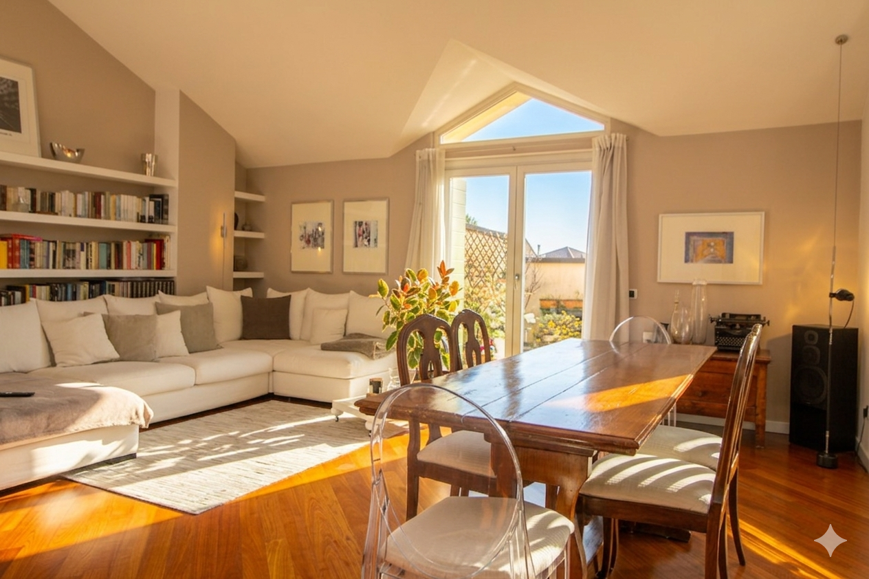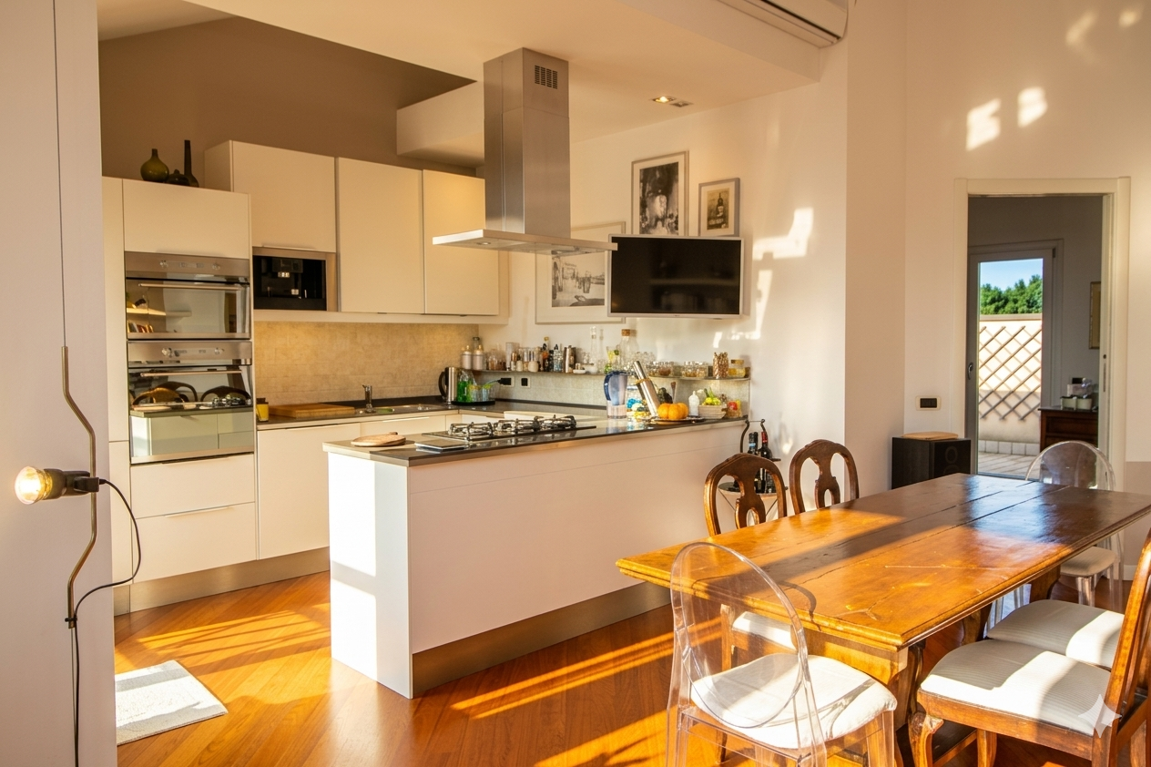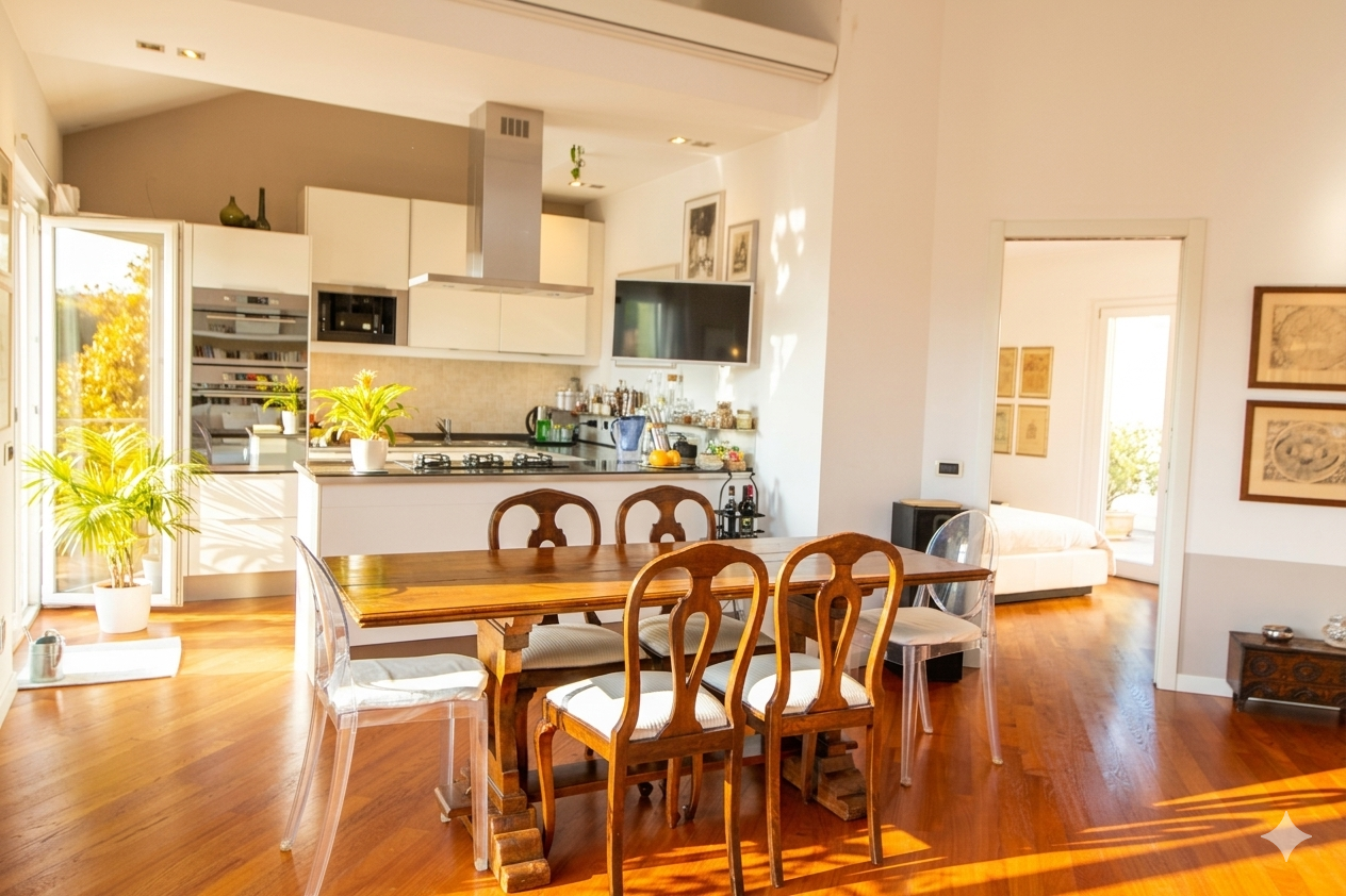 Questo ambiente, cuore pulsante della casa, inondato di luce naturale grazie a due ampie portefinestre che si aprono su un terrazzo profondo e riservato, capace di regalare una vista aperta e mozzafiato, ideale per chi cerca uno spazio esterno vivibile nella massima privacy.