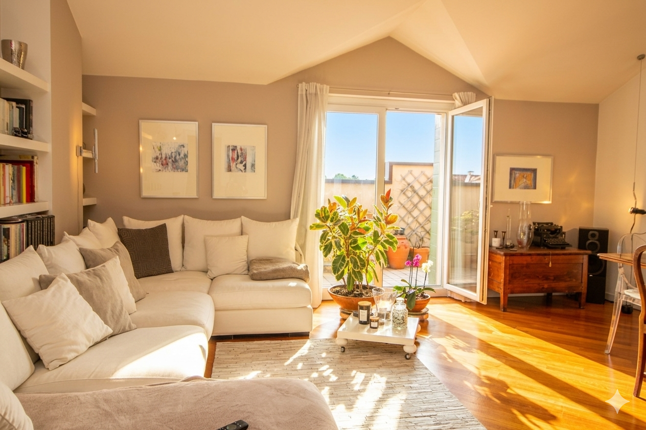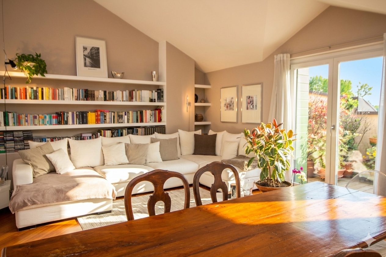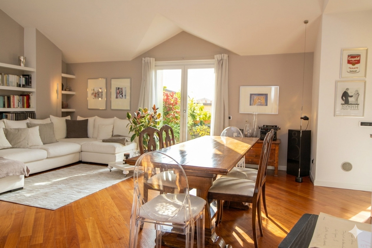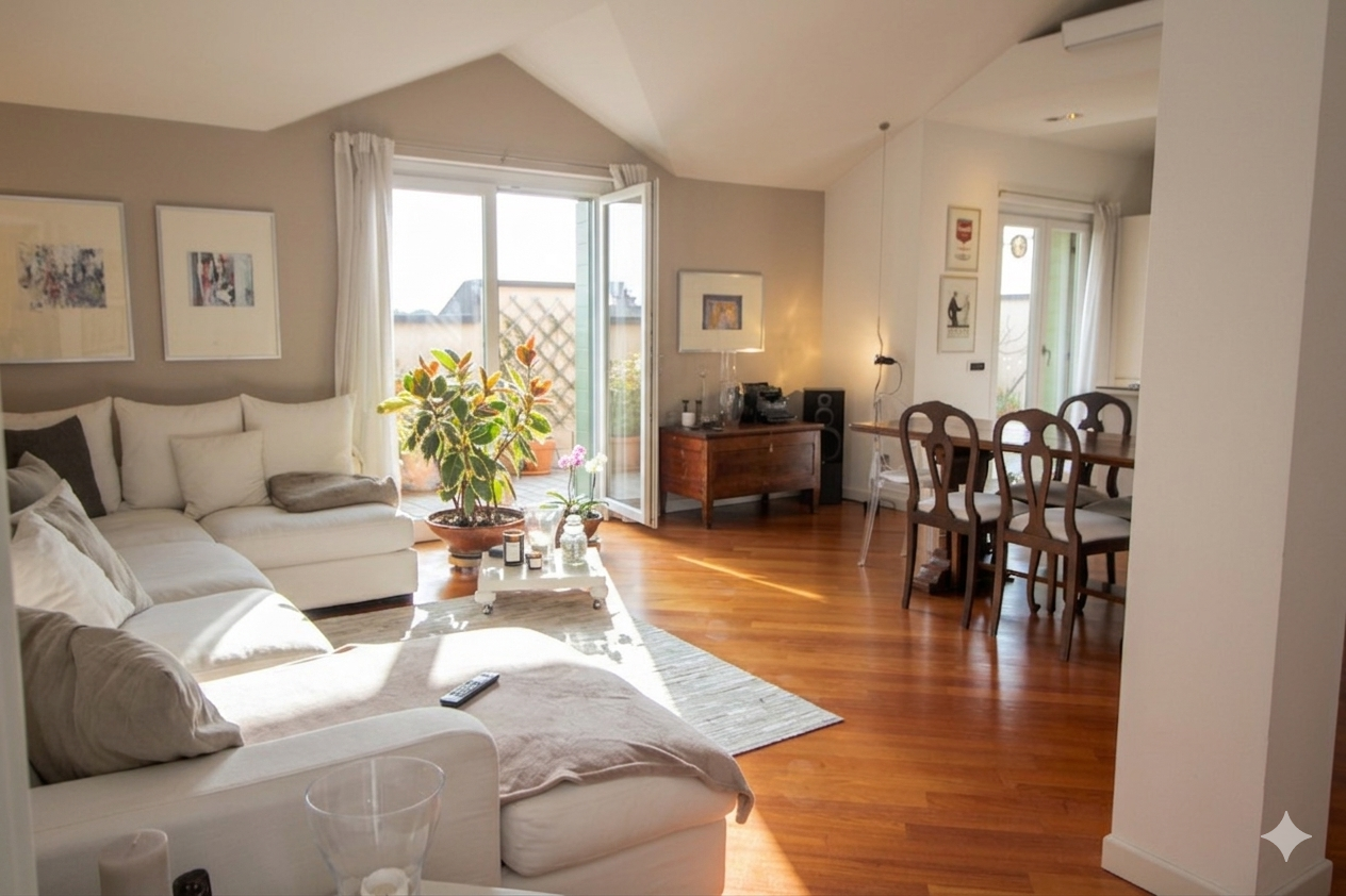 Questo ambiente, cuore pulsante della casa, inondato di luce naturale grazie a due ampie portefinestre che si aprono su un terrazzo profondo e riservato, capace di regalare una vista aperta e mozzafiato, ideale per chi cerca uno spazio esterno vivibile nella massima privacy.