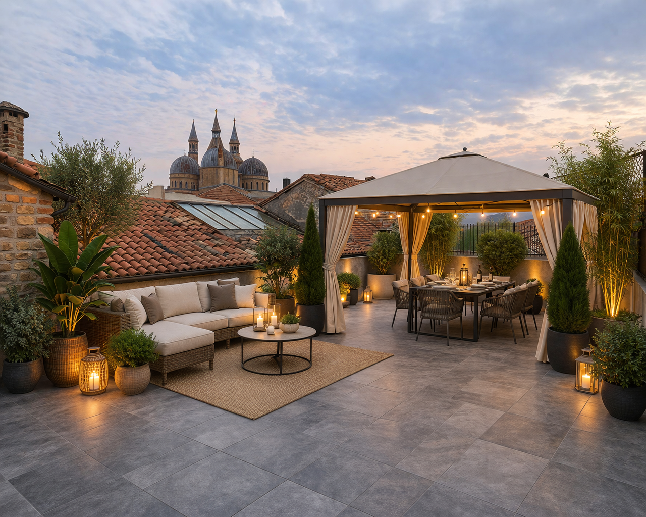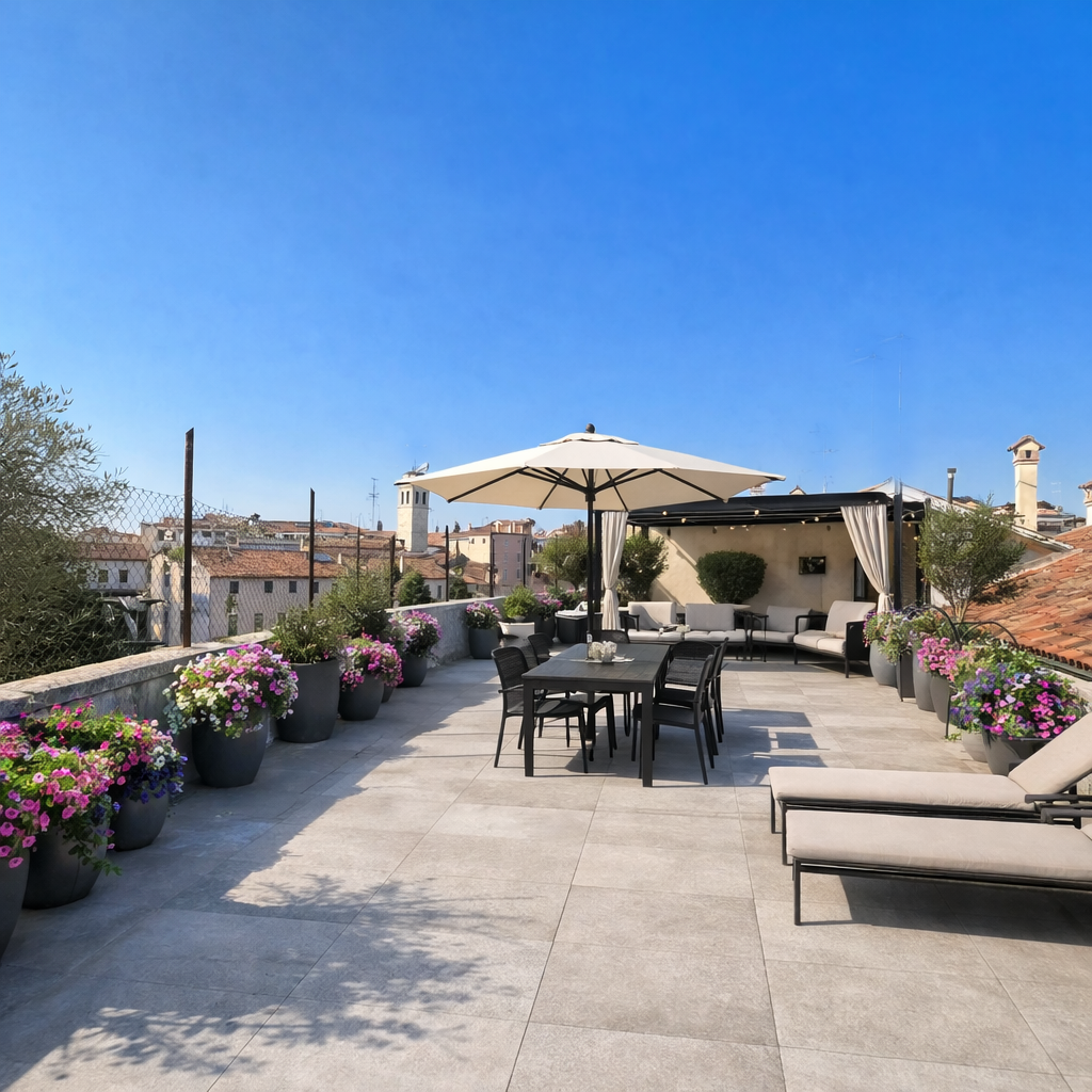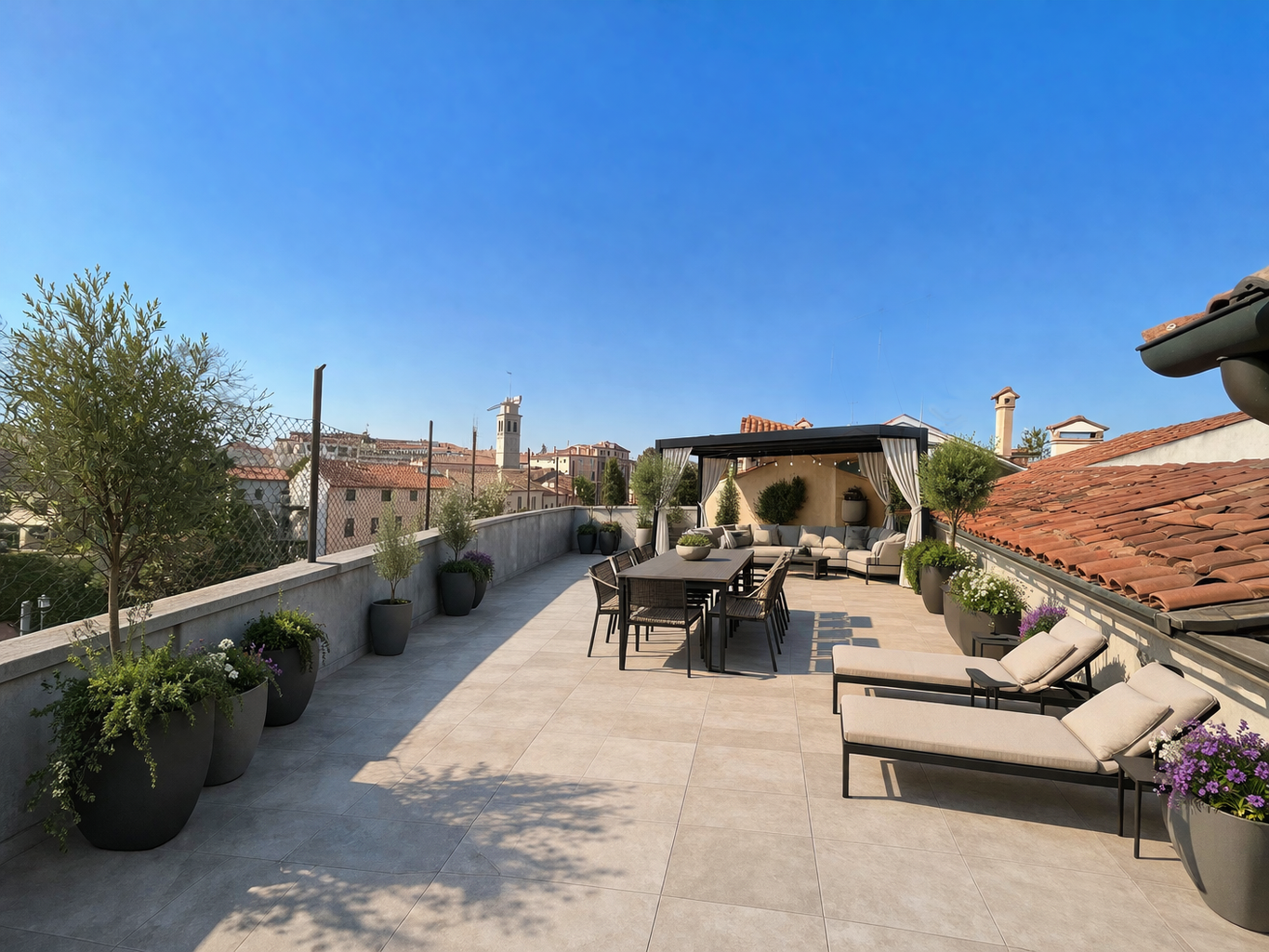 Prestigioso attico caratterizzato da una grande terrazza con una vista di straordinario fascino sulla Basilica di SantAntonio, sulla Basilica di Santa Giustina, su Prato della Valle e sullOrto Botanico: un panorama di raro pregio storico, artistico e paesaggistico.
