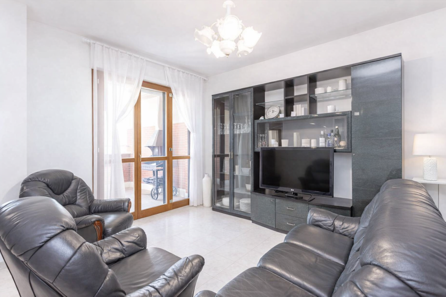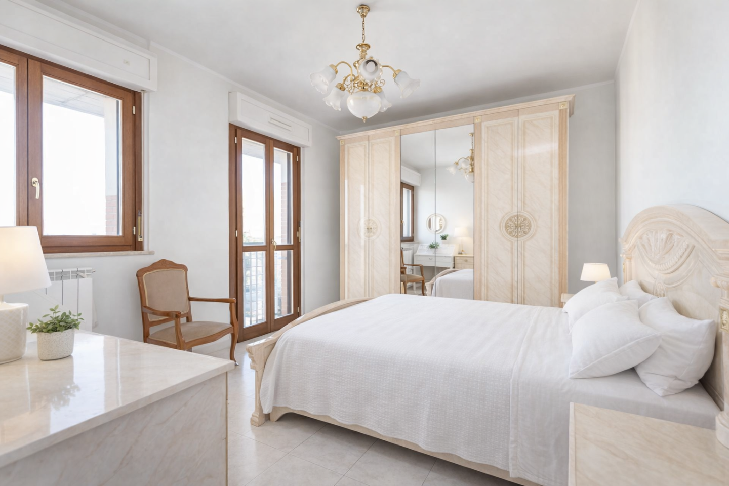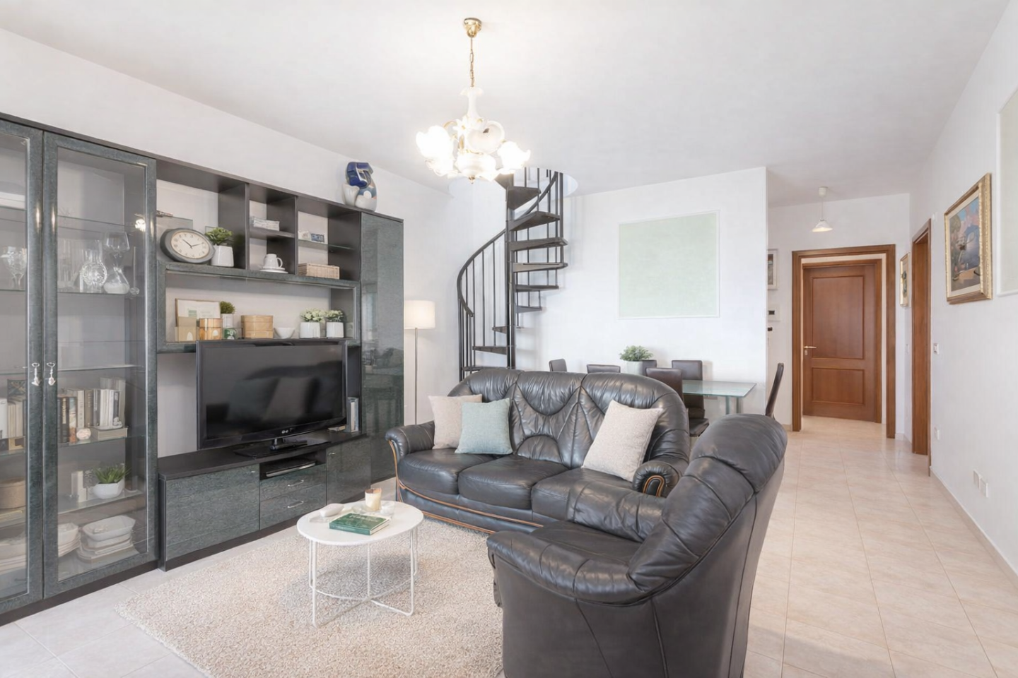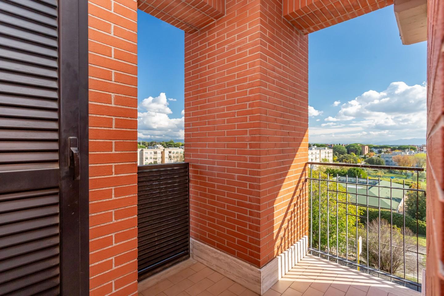 La zona giorno comprende un ampio salone con accesso a una terrazza vivibile di circa 15 mq e una cucina con balcone, mentre la zona notte dispone di due ampie camere matrimoniali, una con bagno en suite e vasca, e un secondo servizio con doccia.
