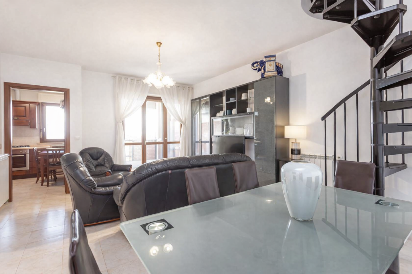 Una suggestiva scala a chiocciola conduce alla grande mansarda, servita da un balcone che si presta ad essere la terza matrimoniale o uno spazio da dedicare ai vostri hobby.