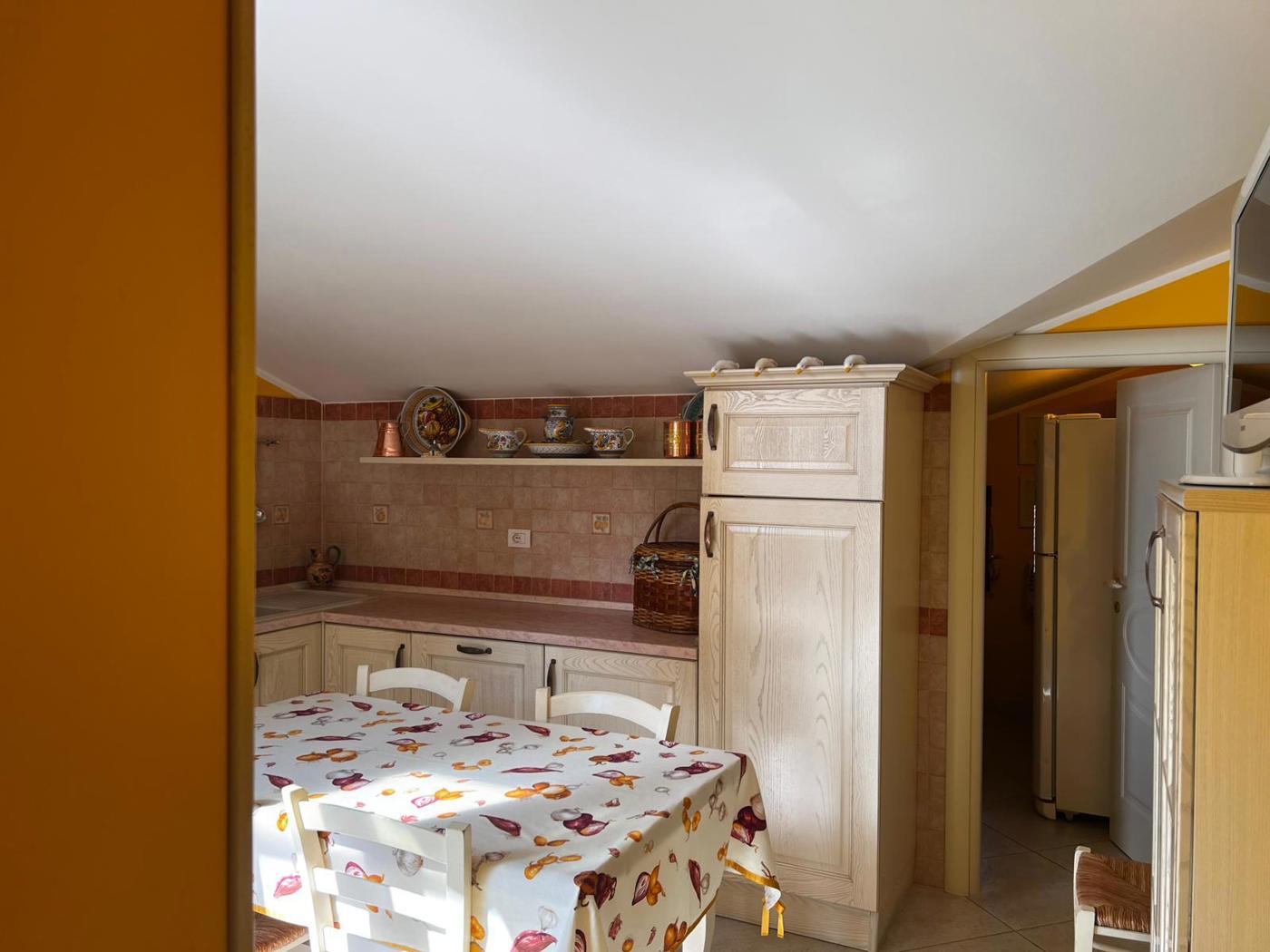 La cucina abitabile, dotata di un pratico ripostiglio, rappresenta il cuore pulsante della casa, perfetta per preparare deliziose pietanze da gustare in compagnia.