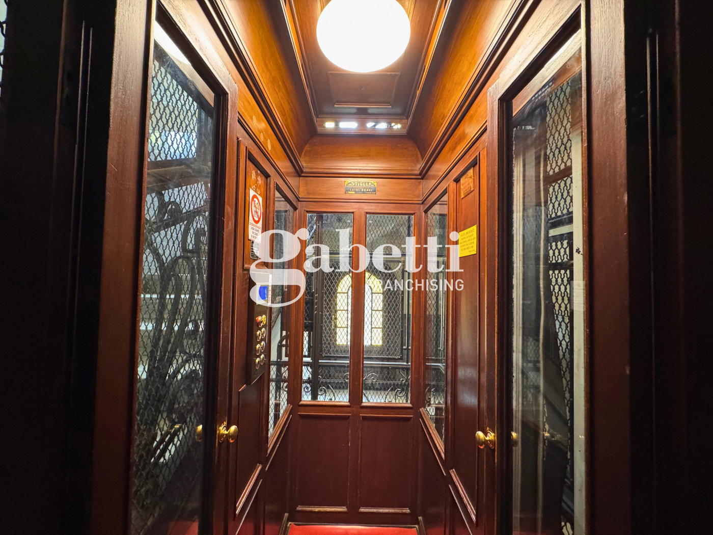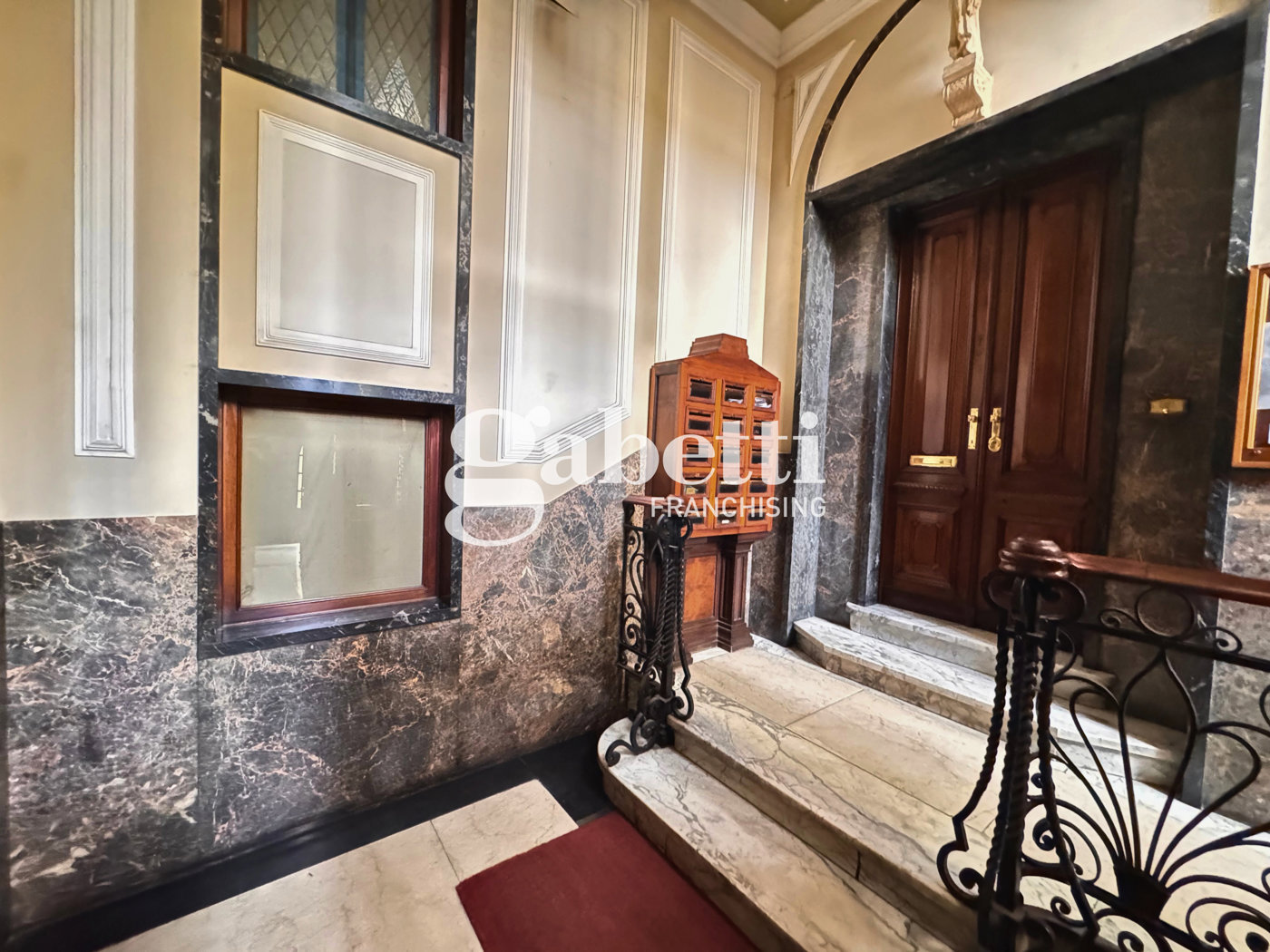 L ingresso condominiale si apre su di un solenne atrio con soffitti a cassettoni, stucchi dorati e marmi policromi che conferiscono allo stabile unatmosfera signorile e curata, inoltre presente un affascinante ascensore d'epoca in legno e vetro con una preziosa ringhiera in ferro battuto lavorato.