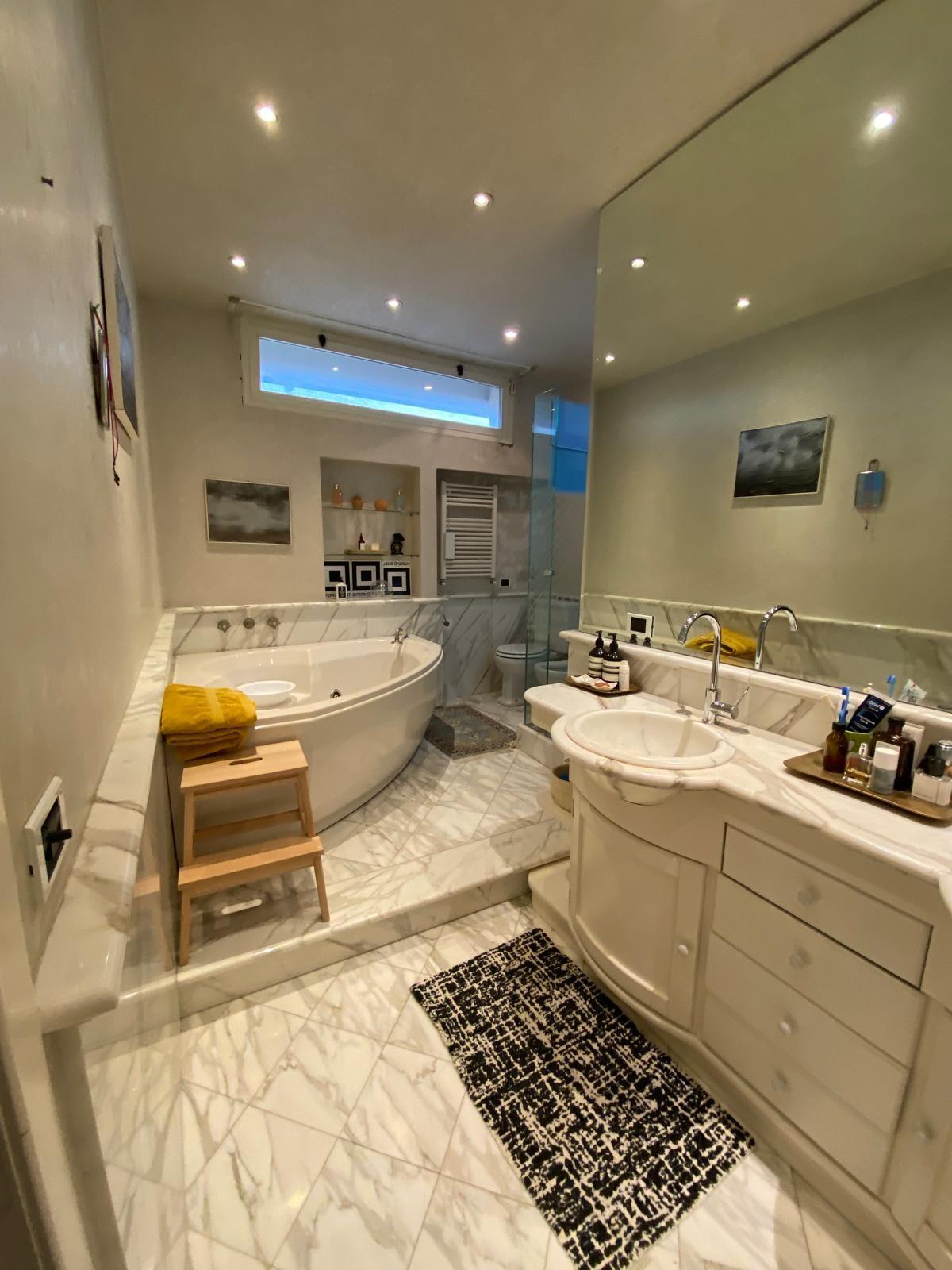 Il bagno padronale, tutto realizzato in marmo di Carrara, è dotato di doccia e vasca idromassaggio.