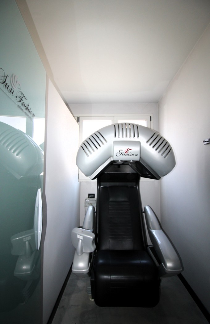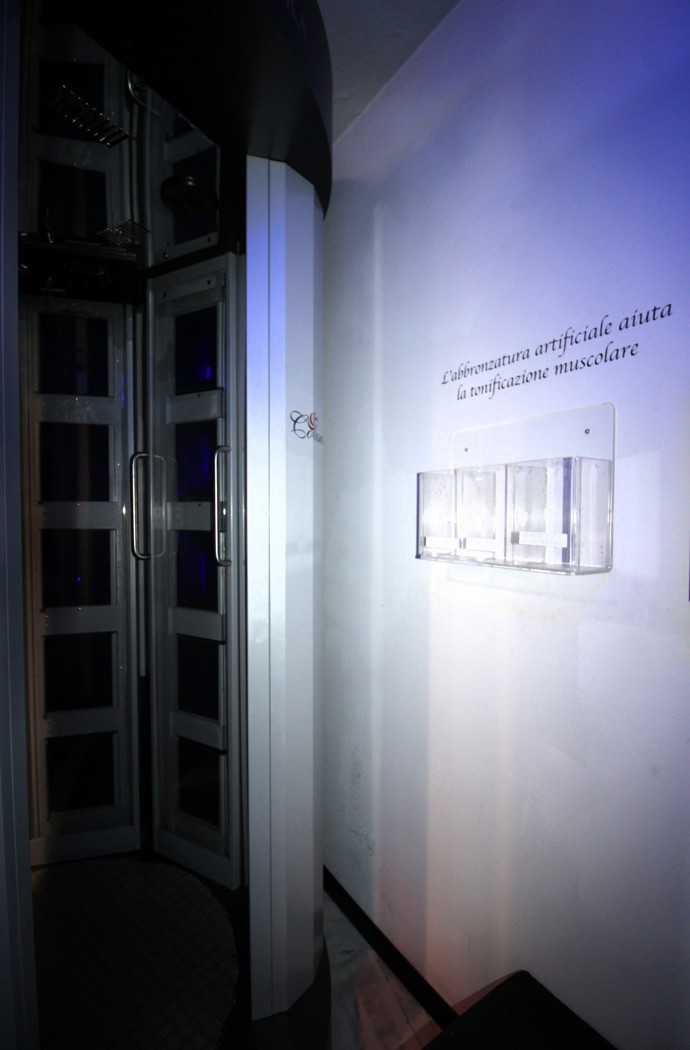 Al suo interno ampia sala accoglienza clienti, due docce solari, un lettino solare, due lampade trifacciali, una pedana vibrante, cabina con doccia, dedicata a cerette e trattamenti estetici, spazio per manicure e pedicure, antibagno e bagno.