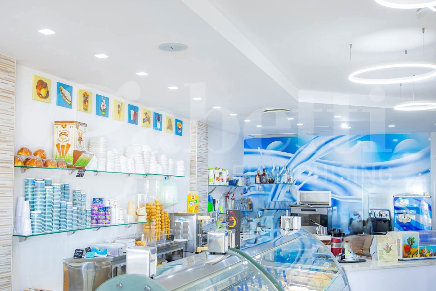 Tra gli equipaggiamenti inclusi troviamo: un pastorizzatore Carpigiani, un pastorizzatore Coldelite, un mantecatore trittico Bravo 1015, un abbattitore 10 teglie della Gemm, un pozzetto congelatore, un lavello con lavastoviglie, bilance, frigoriferi, congelatori, piani di lavoro, planetaria, macchina del caff, forno a 4 teglie, macchina yogurt, lavabicchieri, fabbricatore ghiaccio, montapanna Carpigiani, vetrine 24+12 gusti gelato, carretto crepes, registratore di cassa con stampante e palmare, tavoli e sedie, teca per cornetti, mixer per frapp e frullatore ad immersione.