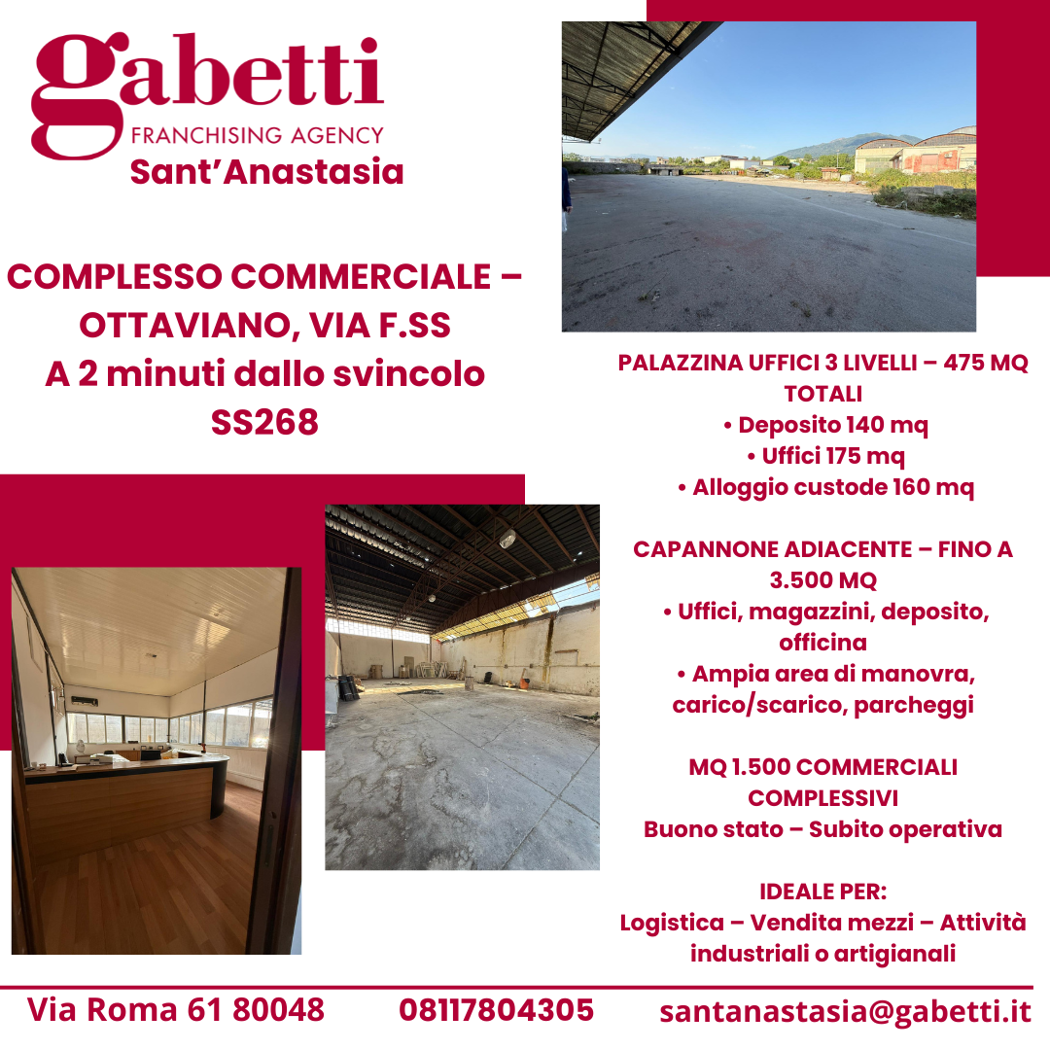 Gabetti Sant'Anastasia VENDE Complesso commerciale in Vendita Ottaviano (NA), Via ***.*******.** Ampio complesso a destinazione commerciale situato in posizione strategica ad Ottaviano, in Via ***.*******.**, a pochi minuti dal centro cittadino e con facile accesso allo svincolo della SS268 (Napoli, Pomigliano dArco, Angri). Composizione dellimmobile: Palazzina uffici di tre livelli: Piano seminterrato adibito a deposito (140 mq) Piano rialzato destinato ad uffici (175 mq) Piano primo destinato ad alloggio custode (160 mq) Capannone adiacente (800 mq) suddiviso in: zona uffici magazzino/deposito officina Ampio piazzale esclusivo (3.500 mq) per manovra mezzi, carico/scarico merci e parcheggio Superficie complessiva calcolata ai fini estimativi: Oltre 1.500 mq tra uffici, capannone e piazzale (con coefficienti tecnici applicati). Caratteristiche: Struttura in buono stato manutentivo Costruzione di tipo medio-moderno con materiali di qualit Immobile agibile e immediatamente utilizzabile Ideale per attivit industriali, commerciali, vendita/riparazione mezzi e attrezzature edili Contatta l'inserzionista