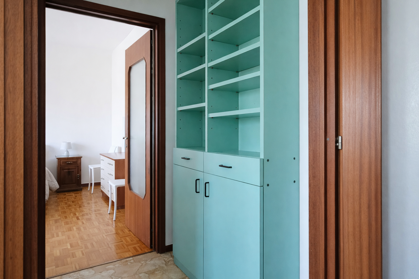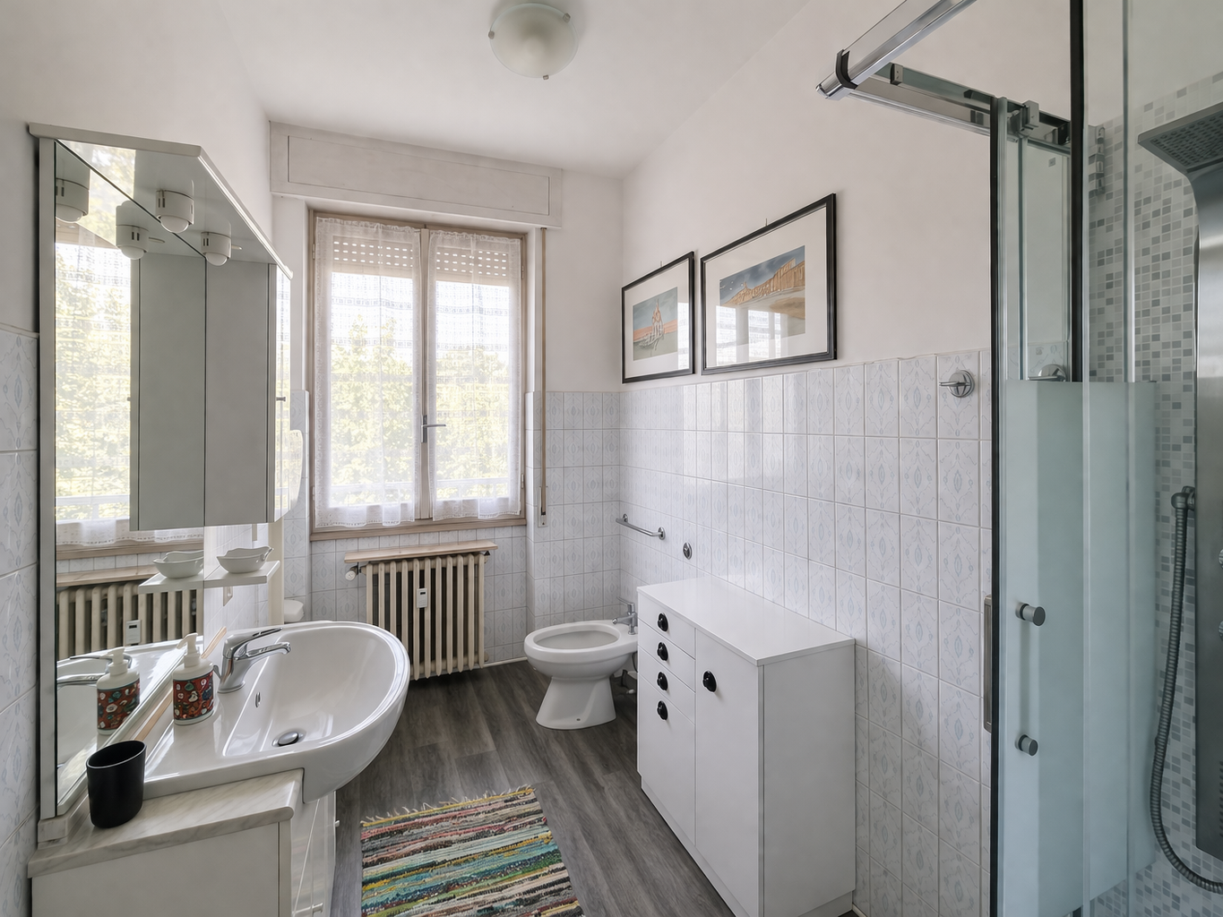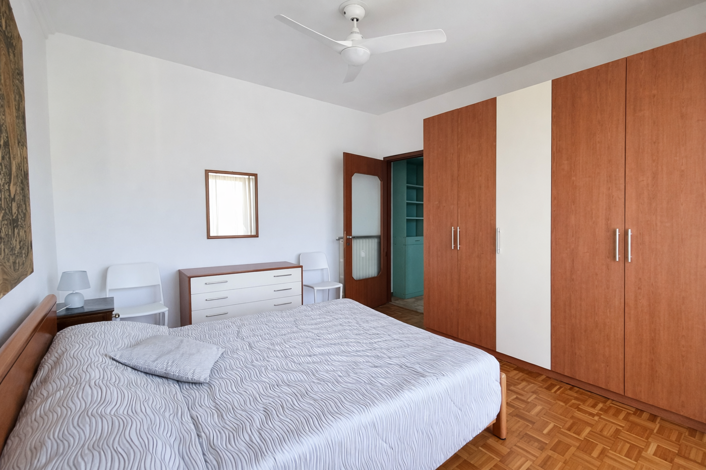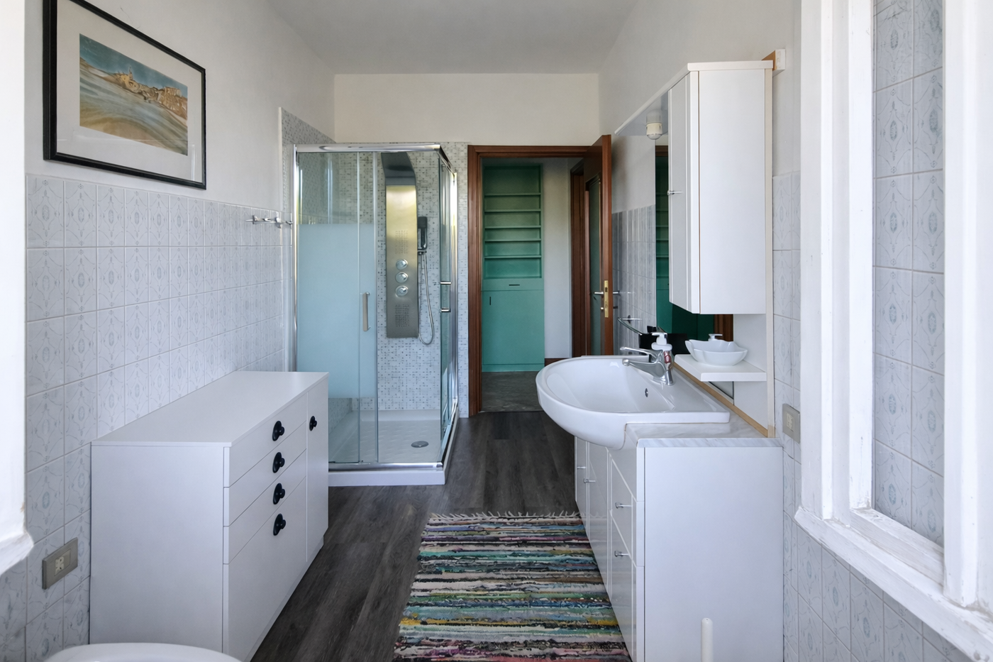 Camera matrimoniale luminosa e bagno con maxi box doccia.