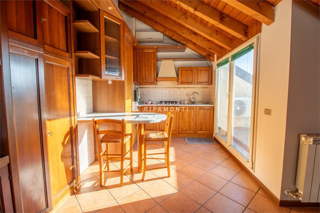BILOCALE a Lecco.\nPosto in piccolo contesto residenziale in Via Risorgimento al quinto piano servito da ascensore sino al quarto piano, con soffitti in travi lamellari a vista abitabile su tutta superficie.