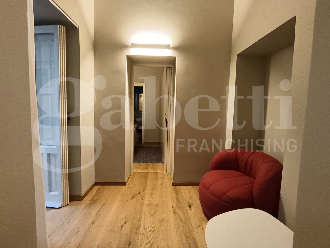 Il piccolo corridoio conduce alla camera matrimoniale (con ampio armadio e letto contenitore)e al bagno in camera (dotato di doccia ampia e finestra). Ogni stanza ha accessoalla verandina,con grata metallica, ed fornita di pompa di calore.