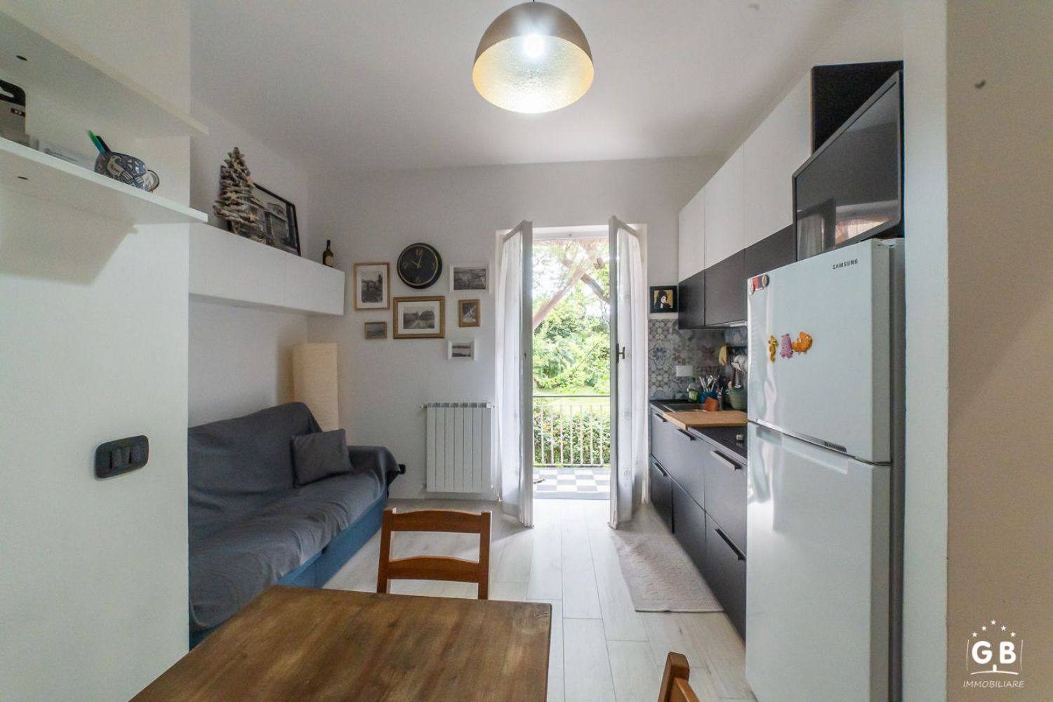 Piccolo appartamento composto da camera da letto con letto a castello, zona giorno con divano letto matrimoniale, bagno con doccia e finestra.