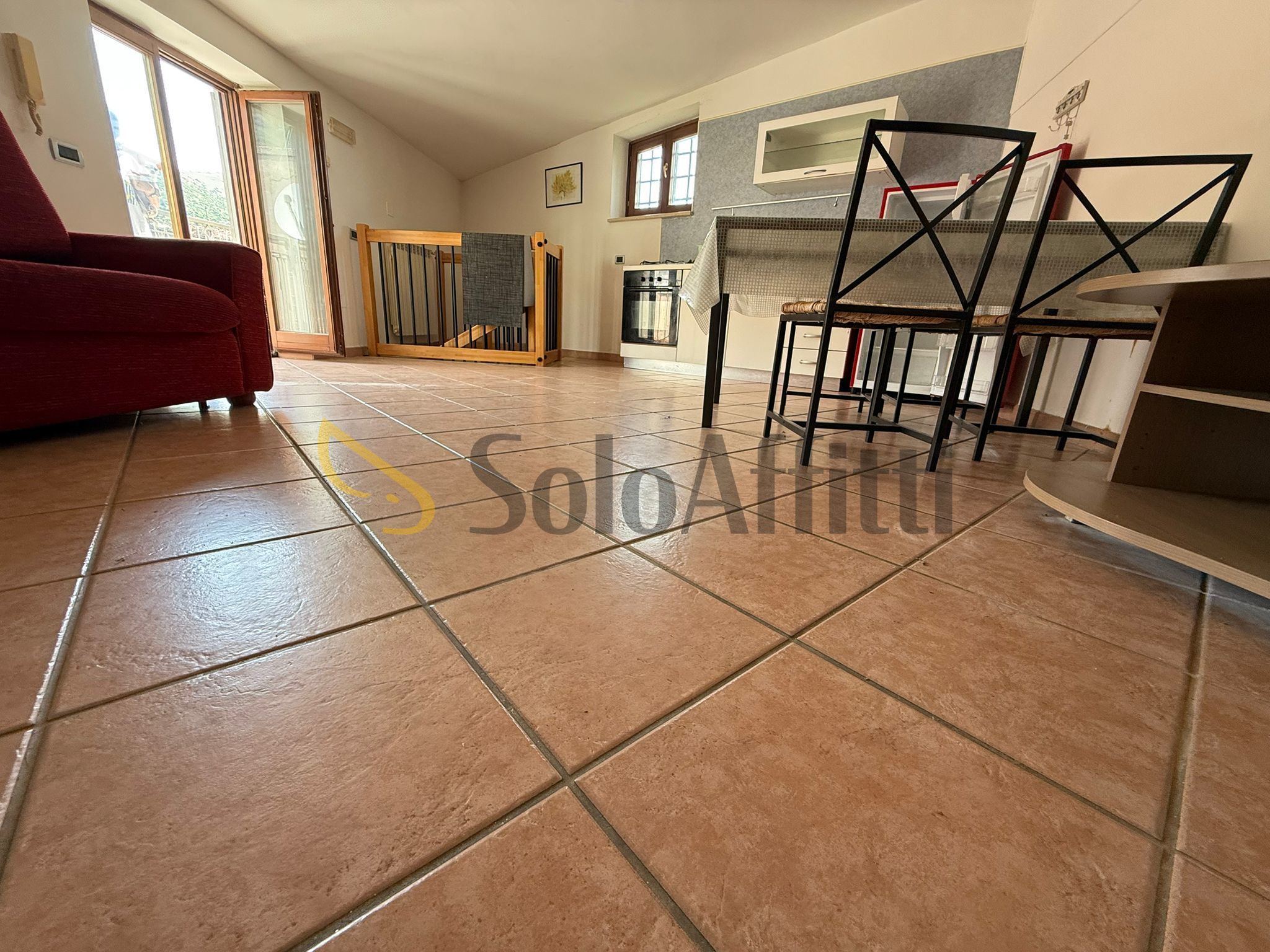 Secondo livello salone con angolo cottura e balcone.