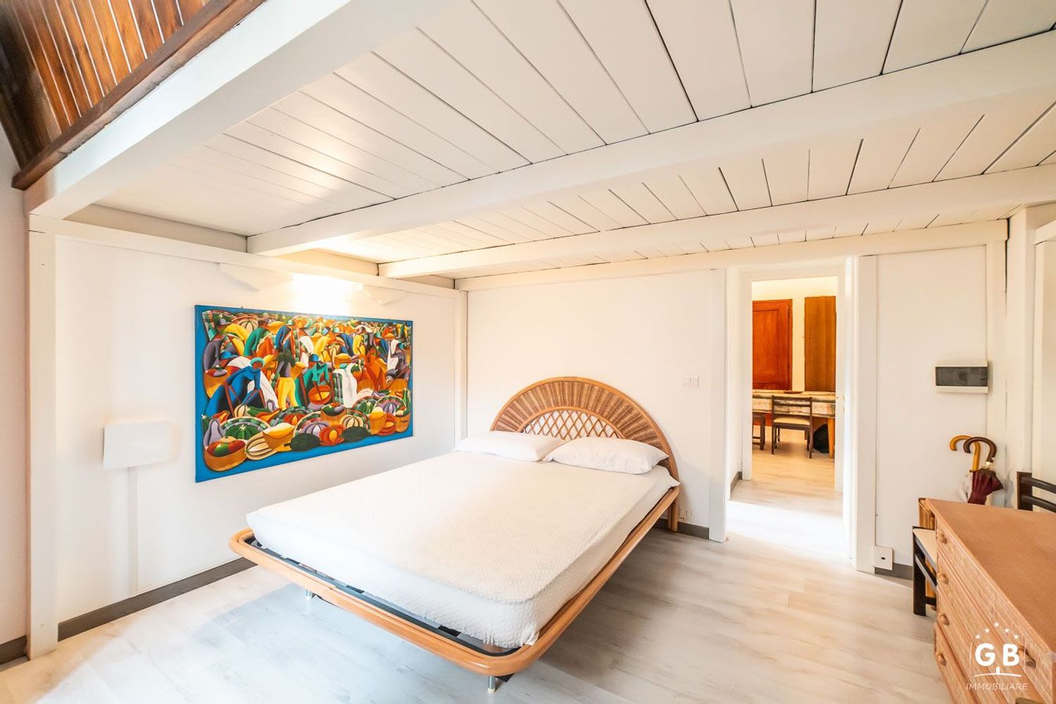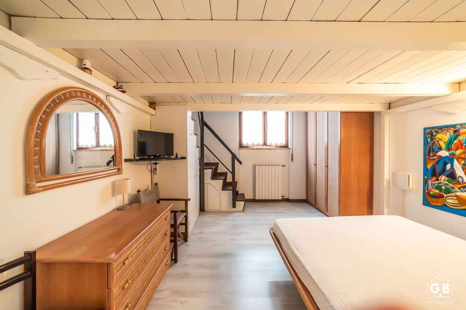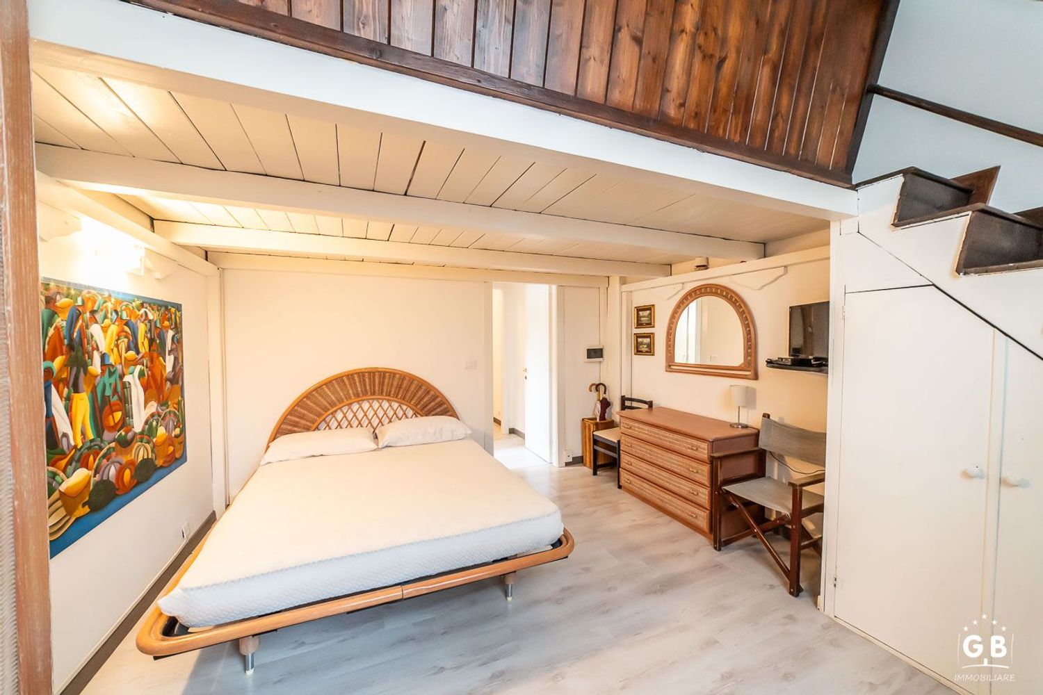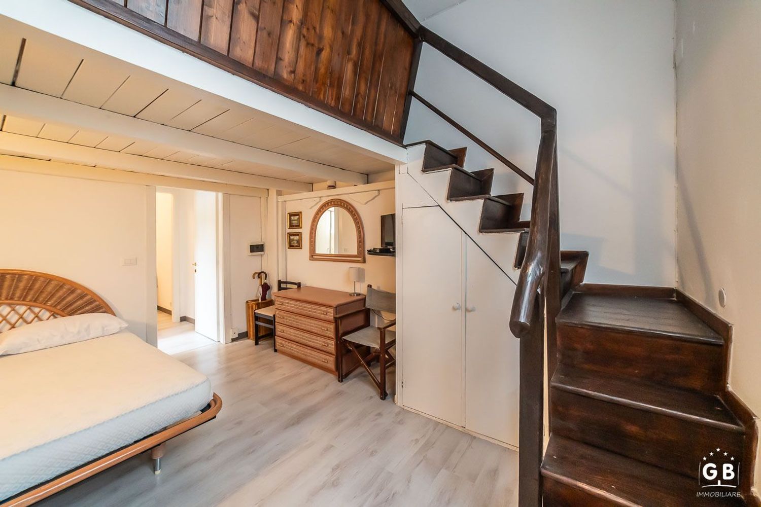 Piano terra, ingresso su cucina a vista e zona pranzo, camera da letto con armadio e letto matrimoniale, soppalco con secondo letto matrimoniale, bagno con doccia e finestra.