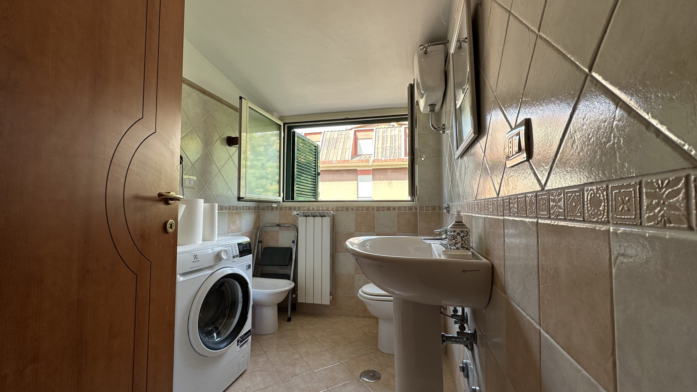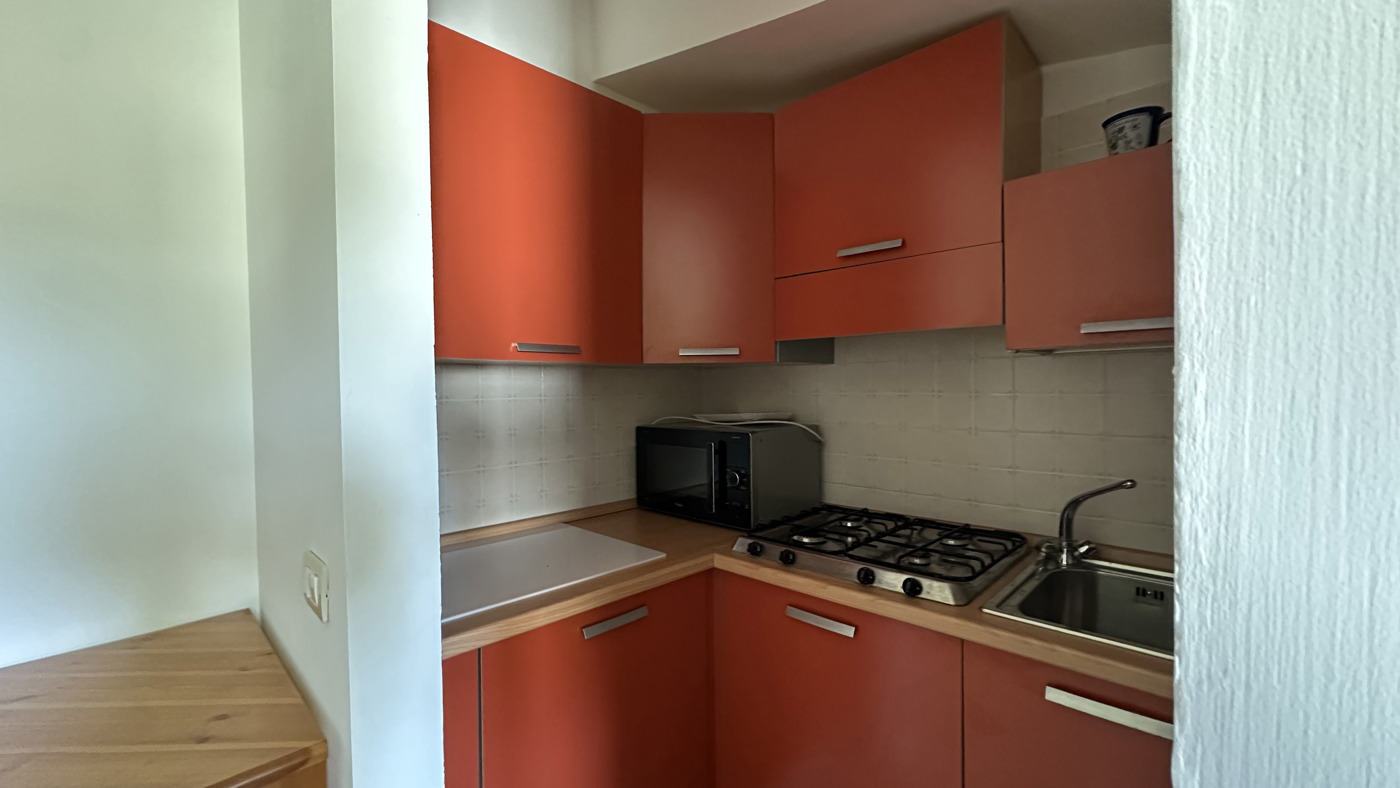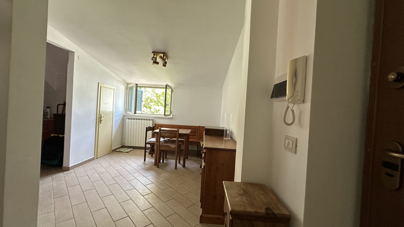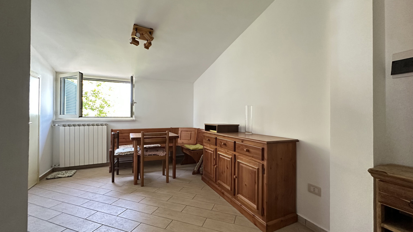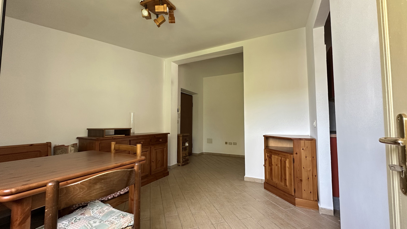 Labitazione si apre su un luminoso salottino con zona cucina a vista, perfettamente organizzato per offrire comfort e funzionalit in un ambiente accogliente.
