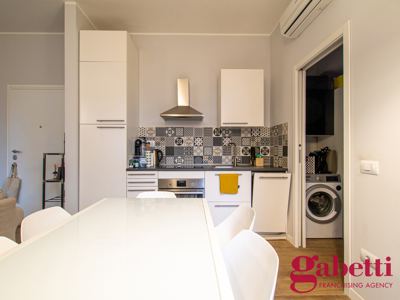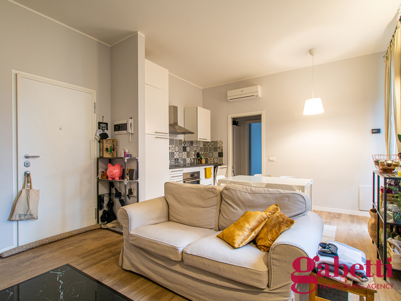 L'appartamento composto da un'ampia zona living con cucina a vista e due grandi finestre con balcone, disimpegno, camera matrimoniale e bagno finestrato.