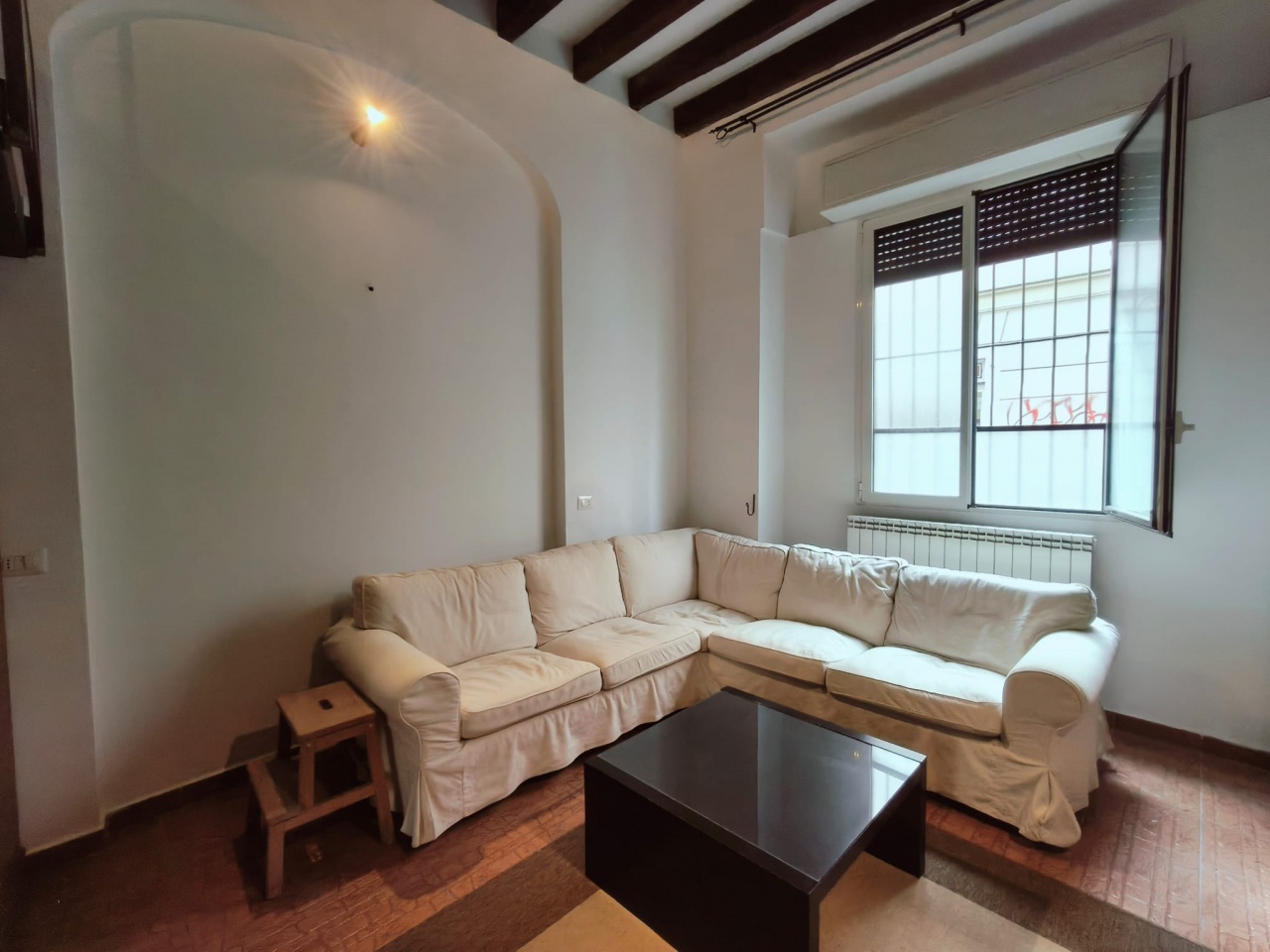 L'appartamento si distingue per i soffitti alti con travi a vista.
