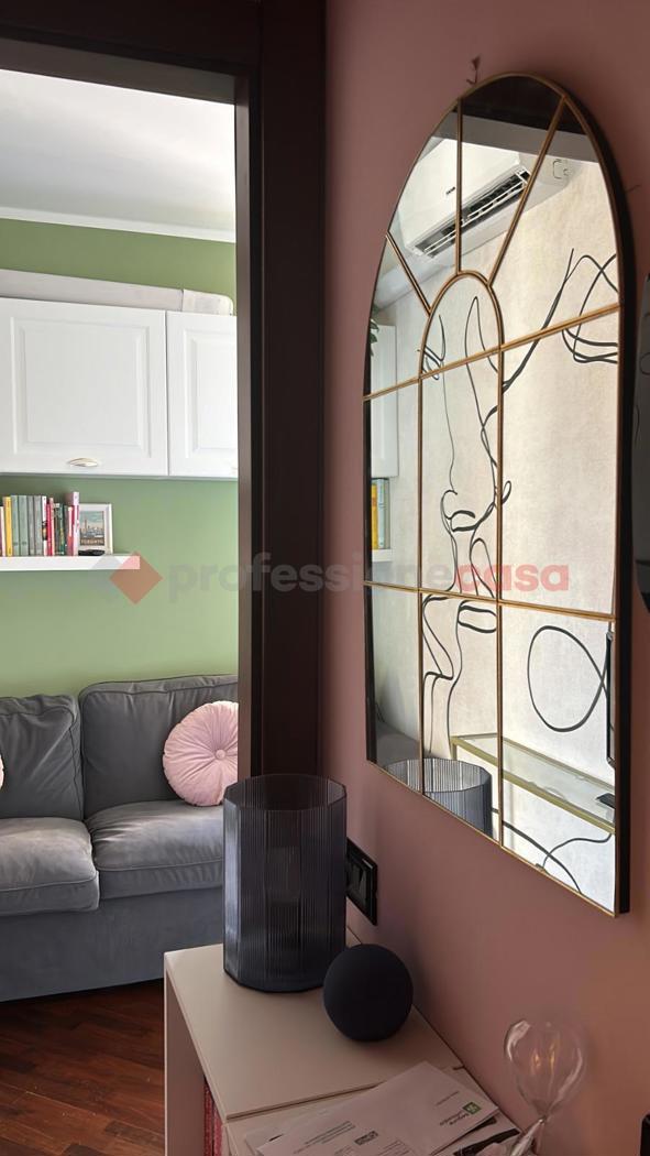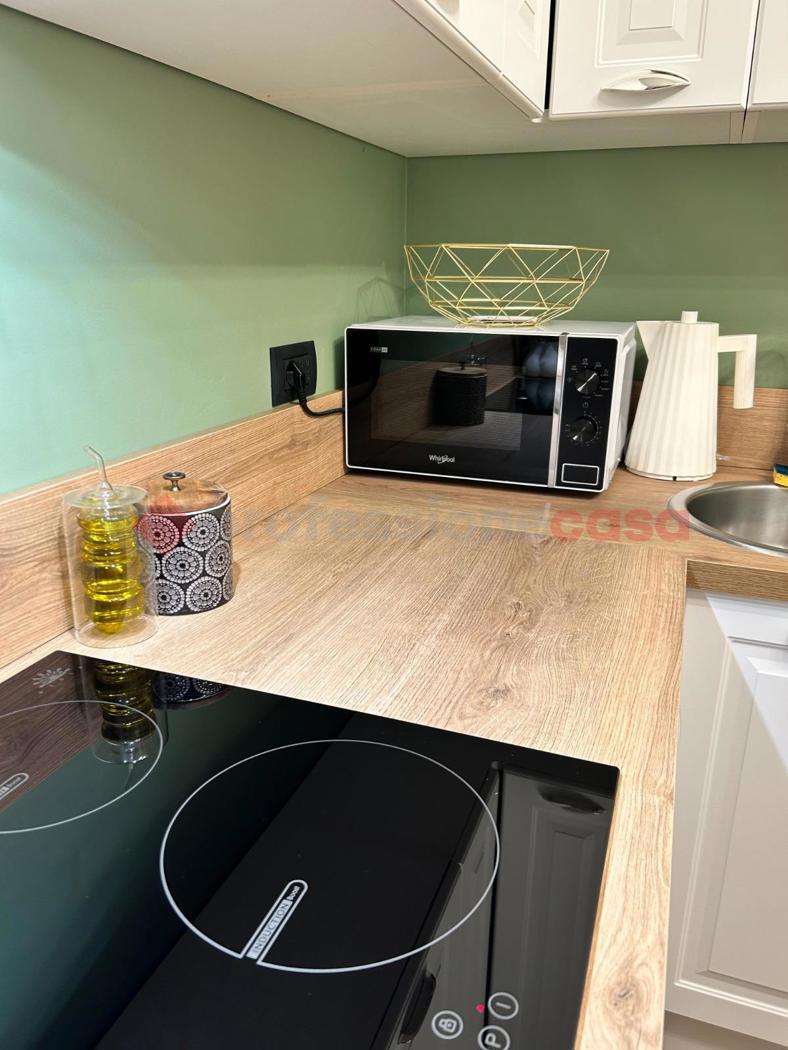 Primo piano, soggiorno luminoso con balconcino, cucina a vista, bagno con doccia e camera matrimoniale.