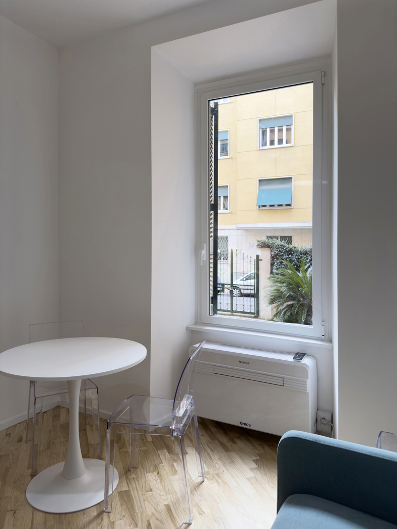 La pavimentazione interamente realizzata in parquet mentre nel servizio, dotato di comodo box doccia, si scelto lutilizzo di un rivestimento in gres. Limpianto autonomo di riscaldamento e condizionamento daria con fan coil Olimpia Unicum, concorre al comfort dellimmobile e, al contempo, al contenimento dei consumi energetici anche grazie agli infissi di ultima generazione dotati di doppi vetri.