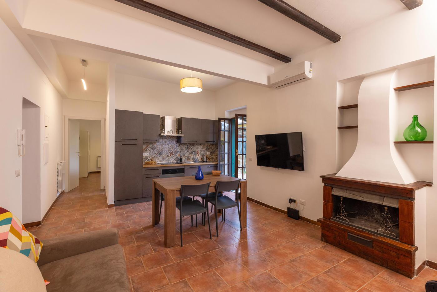 L'appartamento dispone di una camera da letto spaziosa, un bagno finestrato con box doccia, una cucina a vista completamente attrezzata e un luminoso soggiorno con camino.