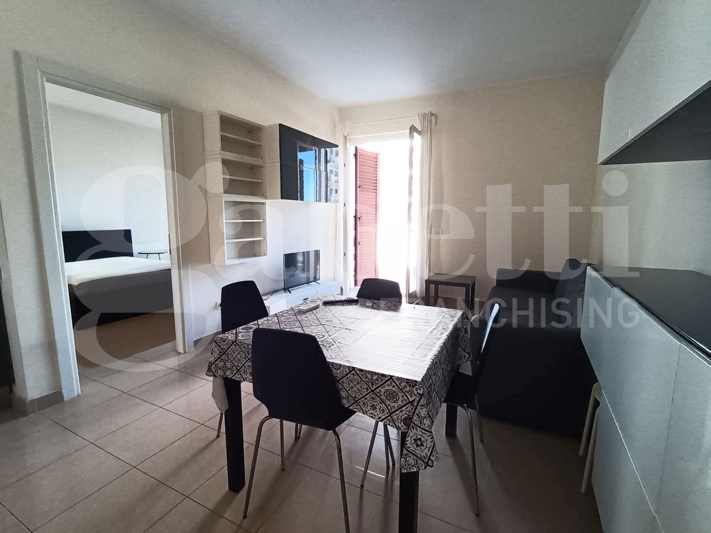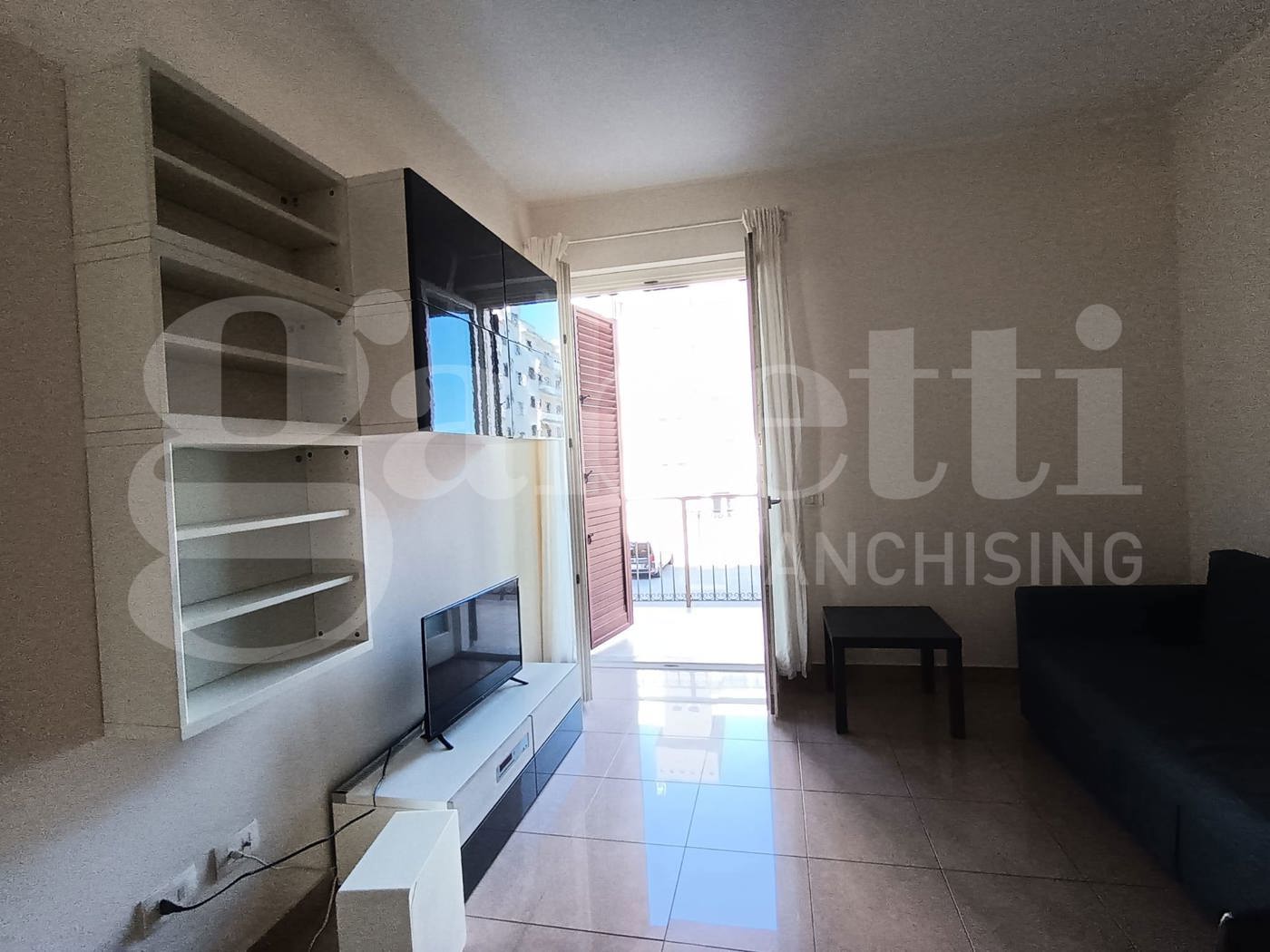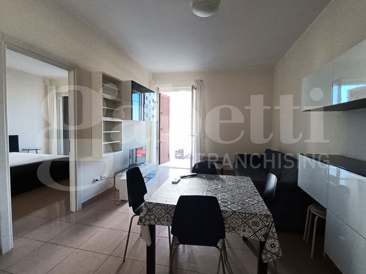 La casa ha ingresso su cucina soggiorno con accesso al balcone, camera da letto matrimoniale con accesso al balcone, bagno con doccia e lavatrice.